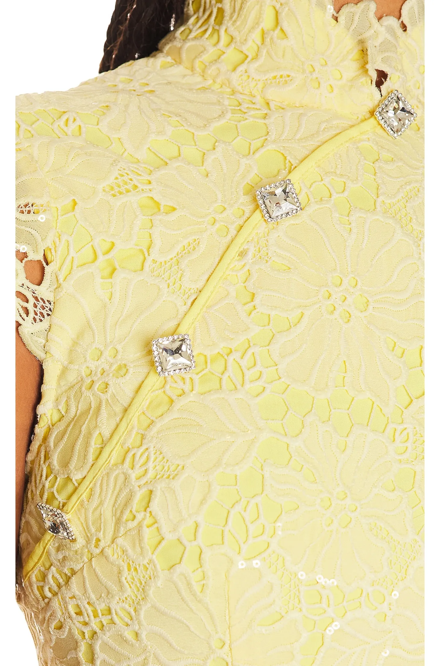 Polyester blend.Imported.Dry clean recommended.Fully lined.Hidden back zipper closure.Crystal embellished appliques throughout.Notched hem