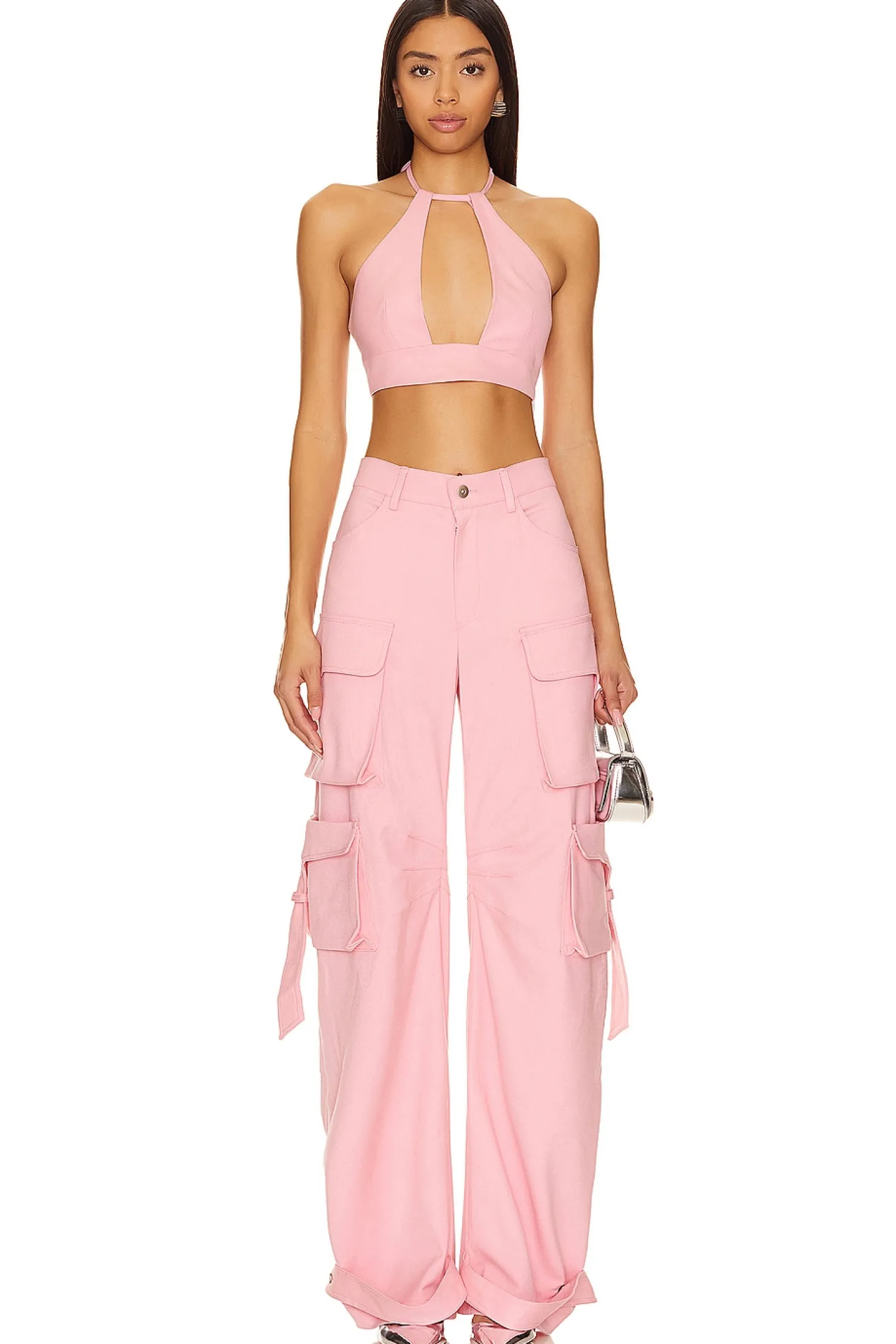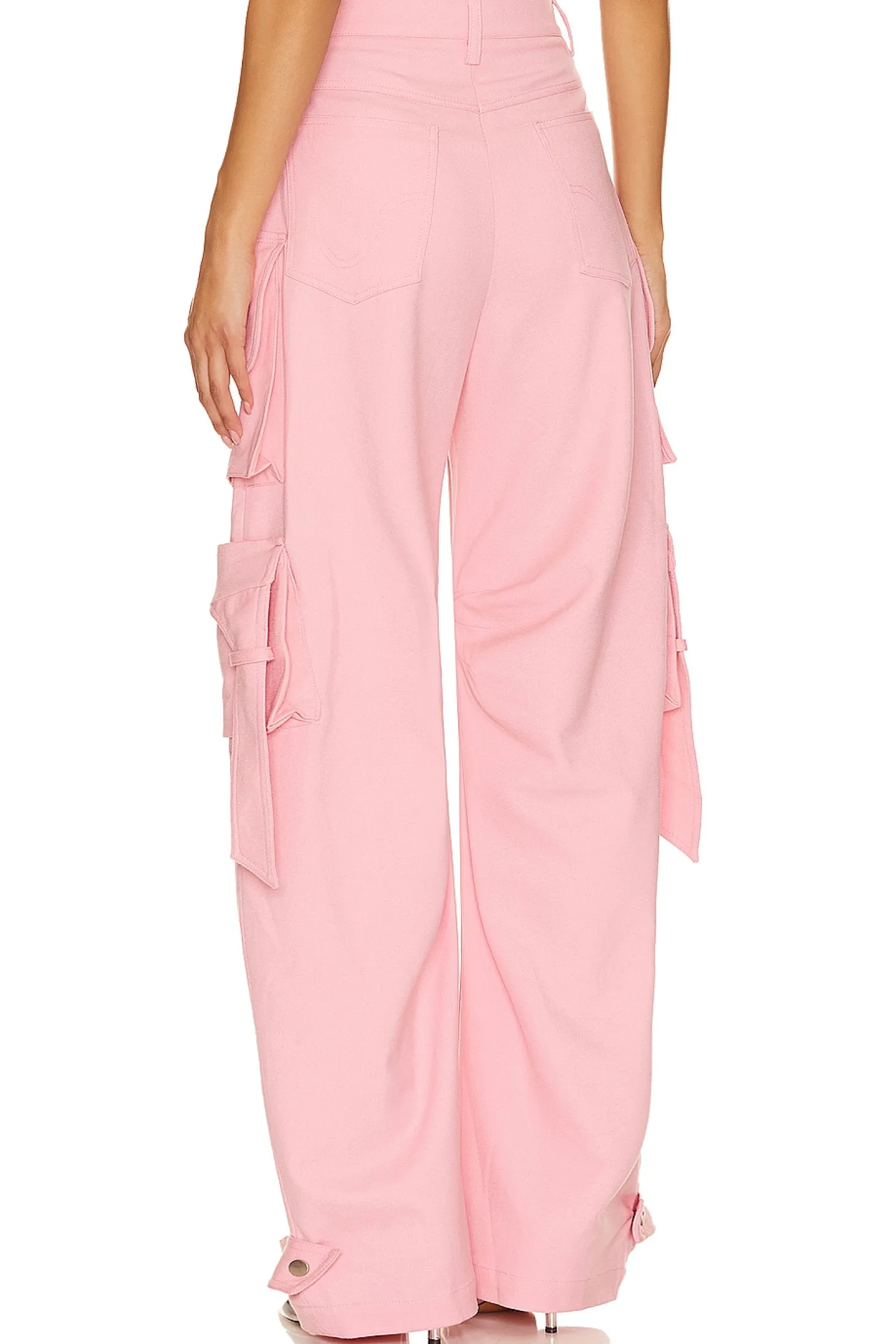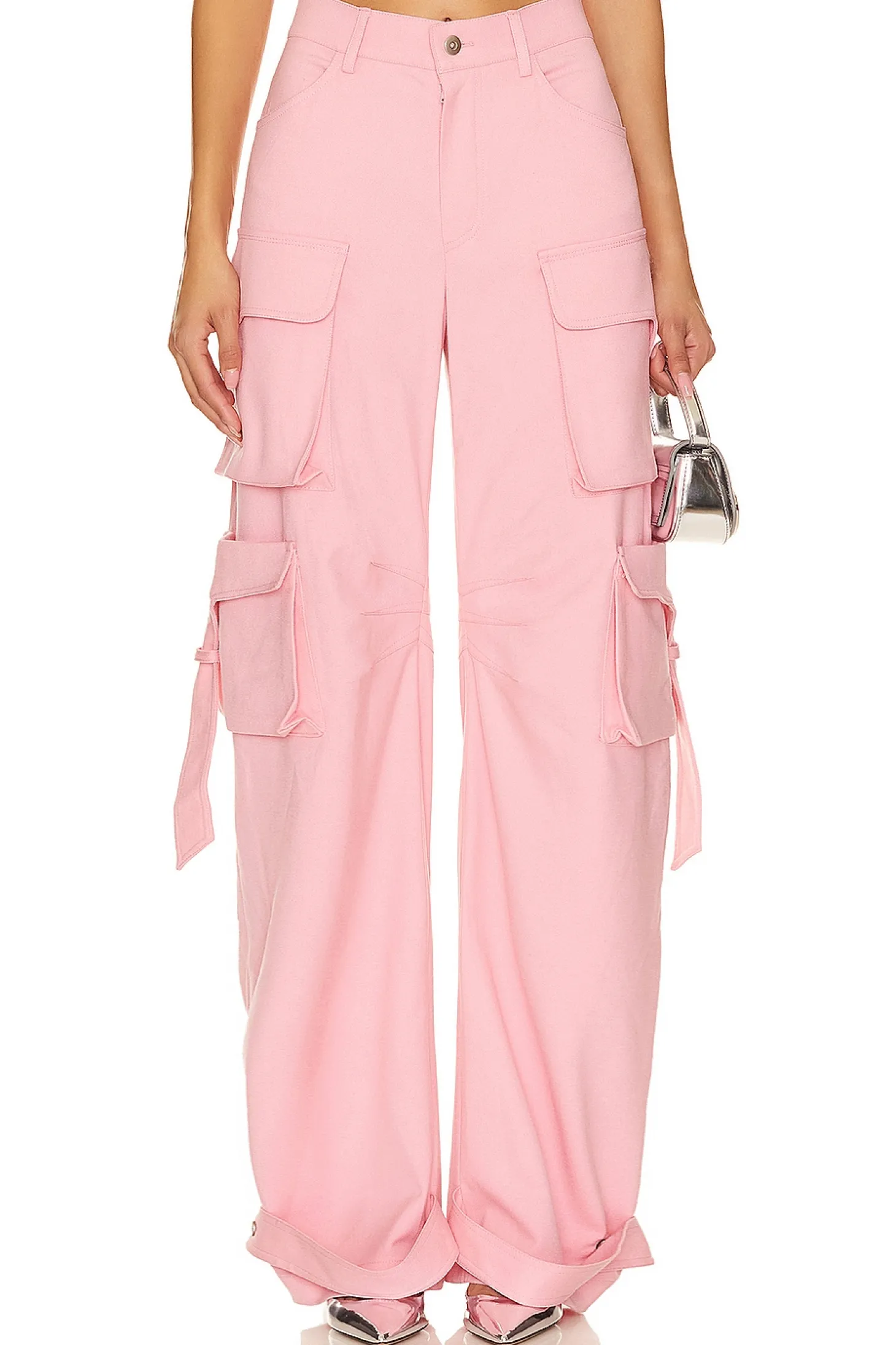 69% polyester 29% rayon 2% elastane.Made in China.Dry clean.Zip fly with button closure.4-pocket styling with 6 cargo pockets.Midweight twill fabric with snap button cuffs.Item not sold as a set.20" at the knee narrows to 18" at the leg opening