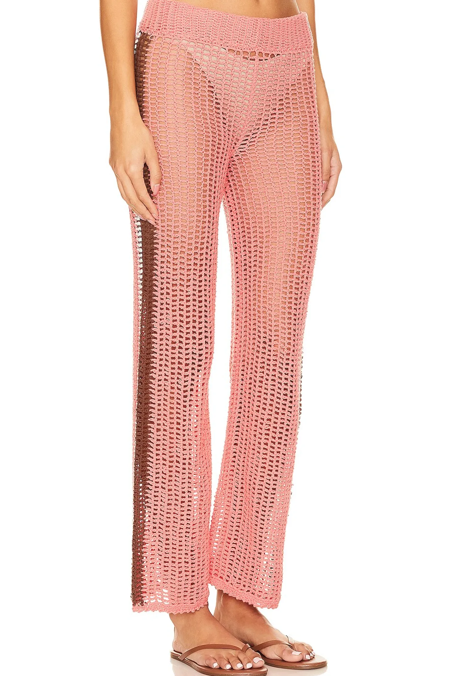 100% cotton.Made in Indonesia.Hand wash.Pull-on styling with elastic waistband.Open crochet knit fabric.Item not sold as a set.Garment is intentionally sheer, undergarments will show through. Please note undergarment not included.16" at the knee breaks to 18" at the leg opening