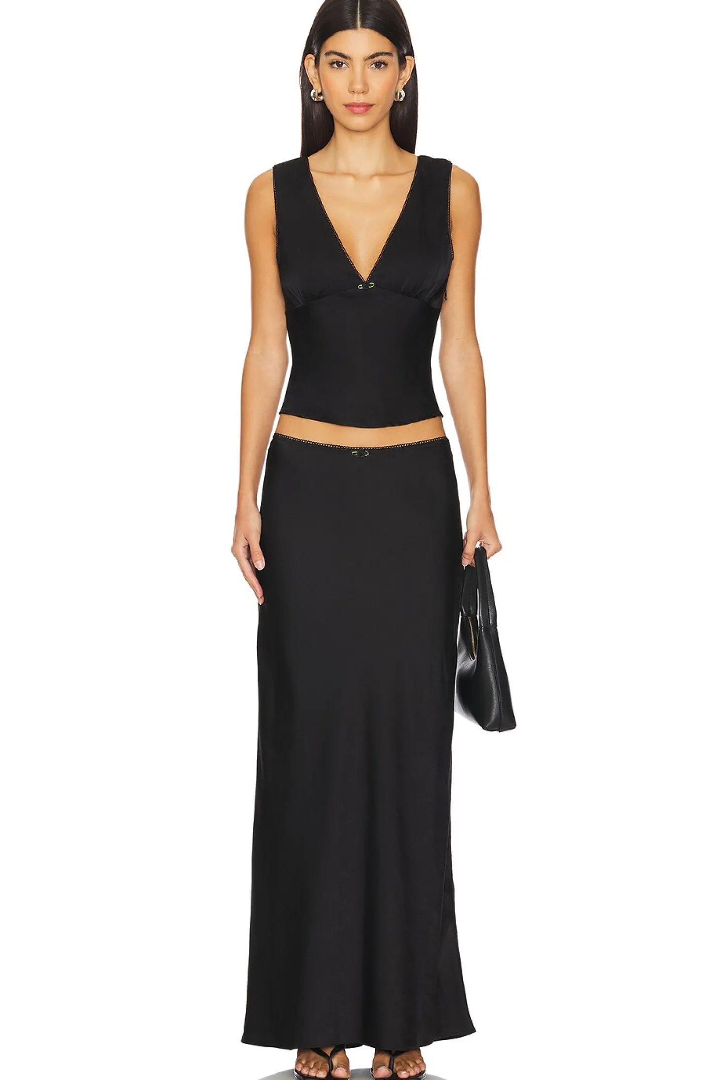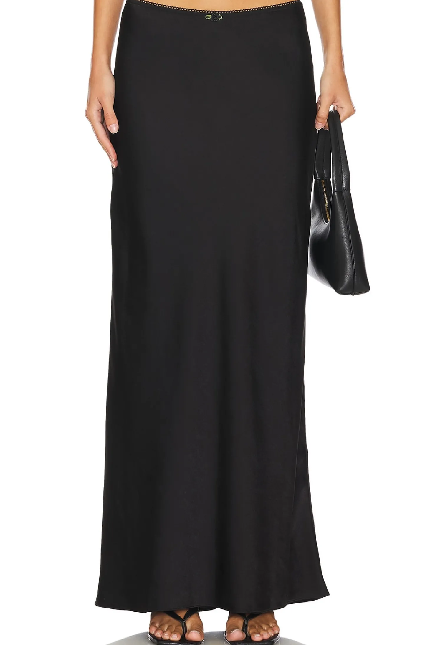 Self: 100% polyester Lining: 95% polyester 5% spandex.Made in China.Hand wash.Fully lined.Pull-on styling.Satin fabric.Skirt measures approx 42" in length