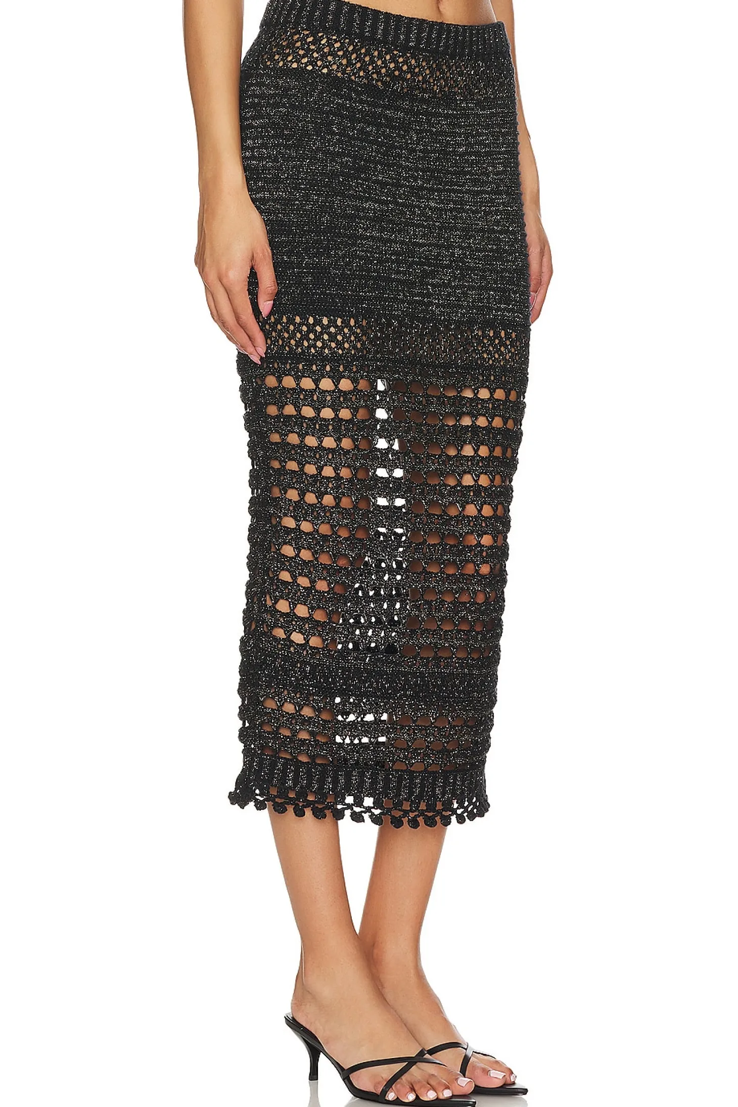 85% cotton 10% polyester 5% metallic.Made in China.Hand wash.Unlined.Pull-on styling.Crochet knit fabric with metallic threading Item not sold as set.Garment is intentionally sheer, undergarments will show through..Skirt measures approx 34" in length Size S waist circumference measures approx 27"