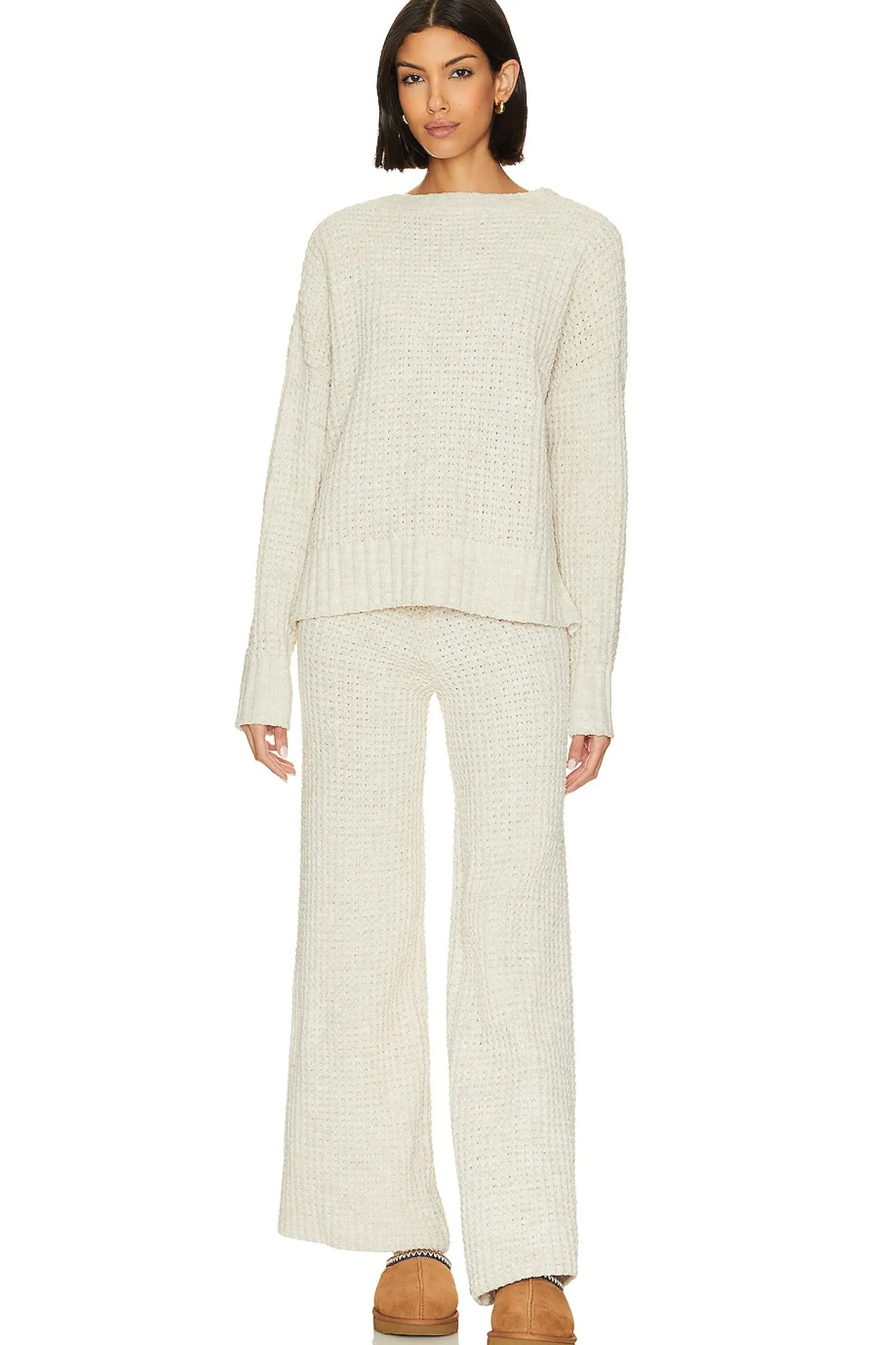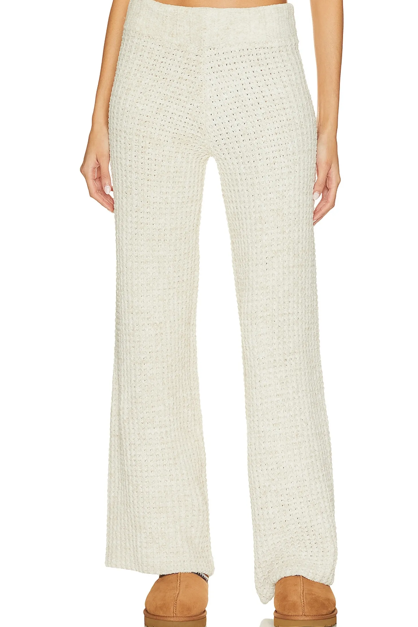 100% polyester.Made in China.Hand wash recommended.Pull-on styling with elastic waistband.Soft open knit fabric.Item not sold as a set.21" at the knee and 21" at the leg opening.The BEACH RIOT Rayne Pant in Snow Cloud is made from a soft and cozy fabric, perfect for lounging or casual wear.