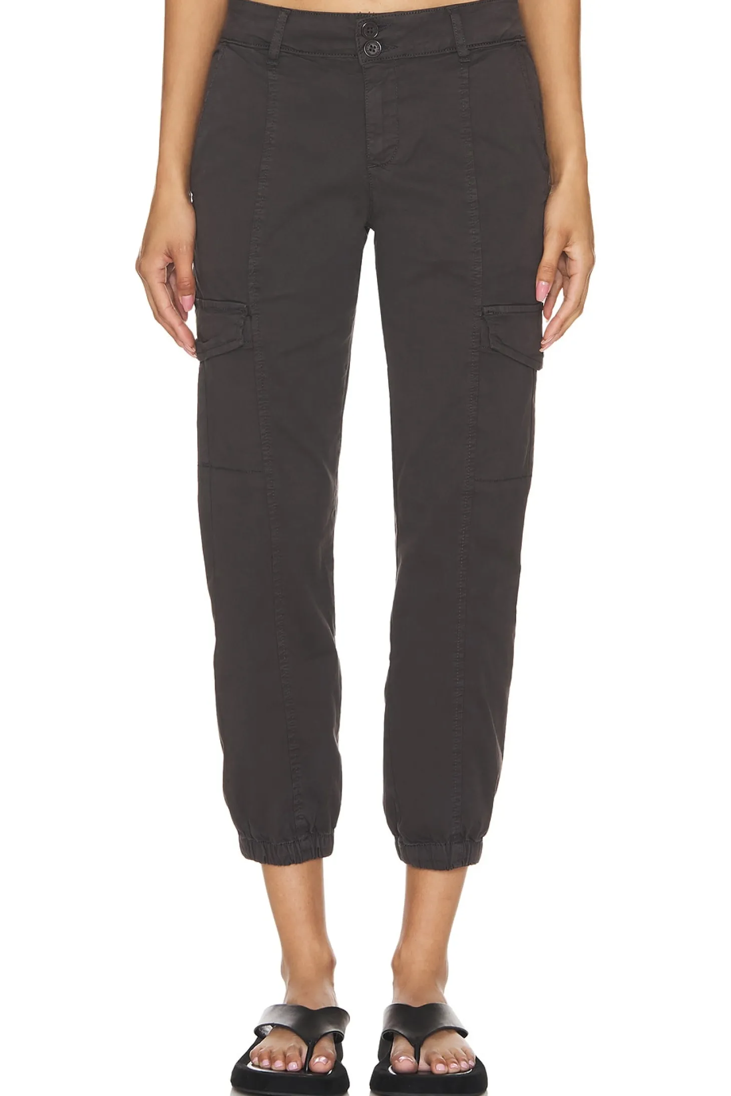 97% cotton 3% spandex.Made in Pakistan.Machine wash.Zip fly with button closure.4-pocket design.Cargo pockets.Lightweight twill fabric.16" at the knee narrows to 10" at the leg opening