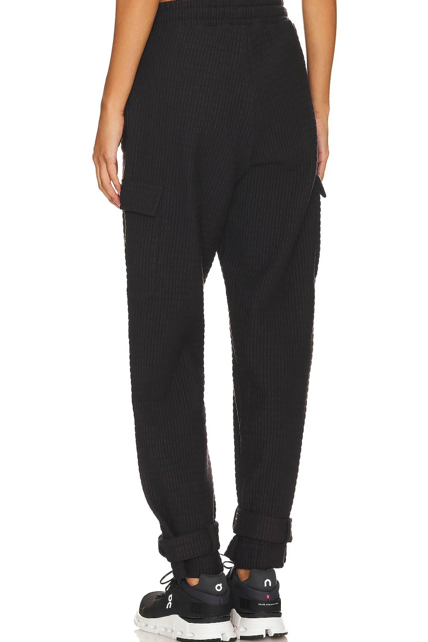 86% polyester 13% cotton 1% spandex.Made in China.Machine wash.Elastic drawstring waistband.Side slant pockets and cargo style pockets.Cuff tabs with snap button closure.Textured jersey fabric.18" at the knee narrows to 16" at the leg opening