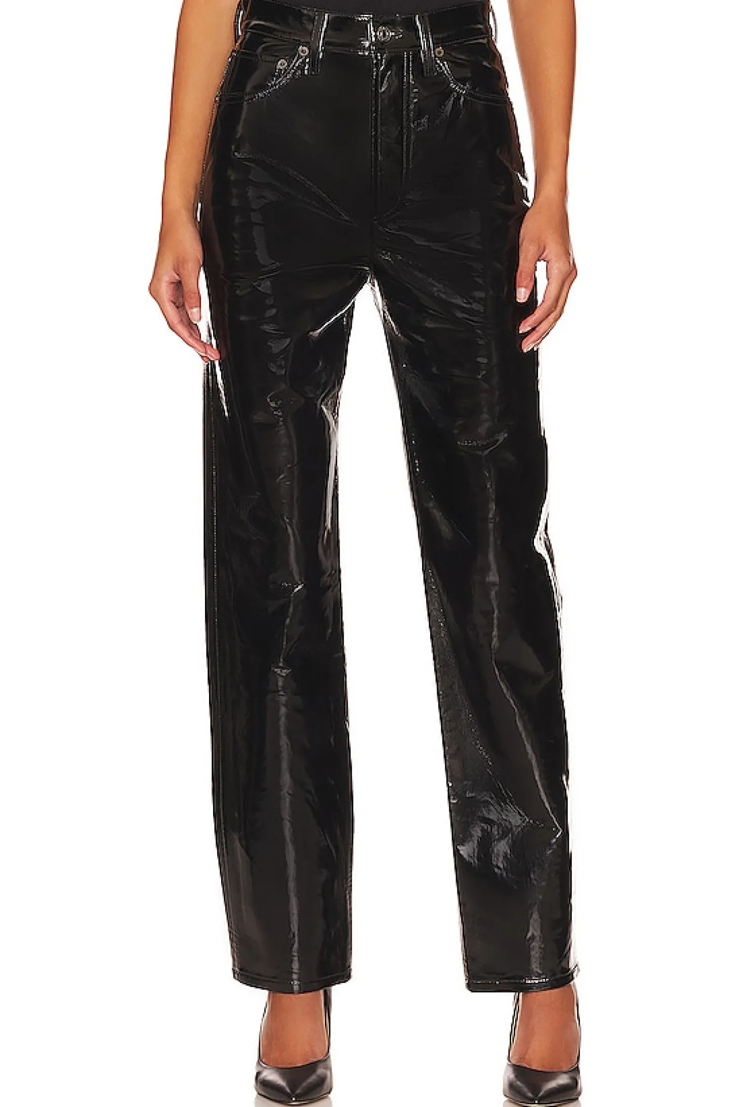 50% recycled leather 30% polyurethane 10% viscose 10% polyester.Made in Turkey.Dry clean only.Zip fly with button closure.5-pocket design.Patent leather fabric.15" at the knee narrows to 13" at the leg opening