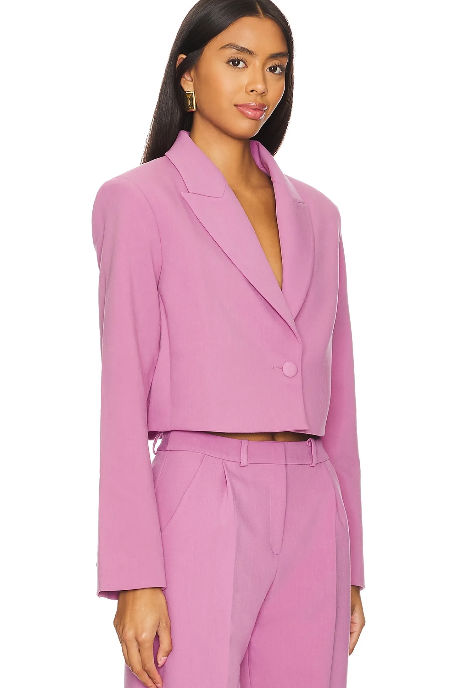 Self: 75% polyester 19% viscose 6% elastane Lining: 100% polyester.Made in USA.Dry clean only.Singular front button closure.Padded shoulders.Button cuffs.Midweight crepe fabric.Item not sold as a set