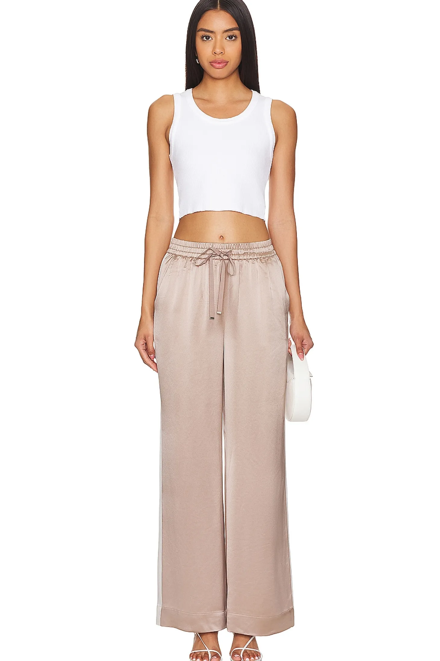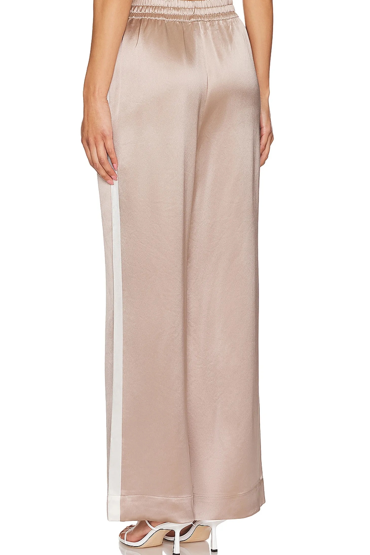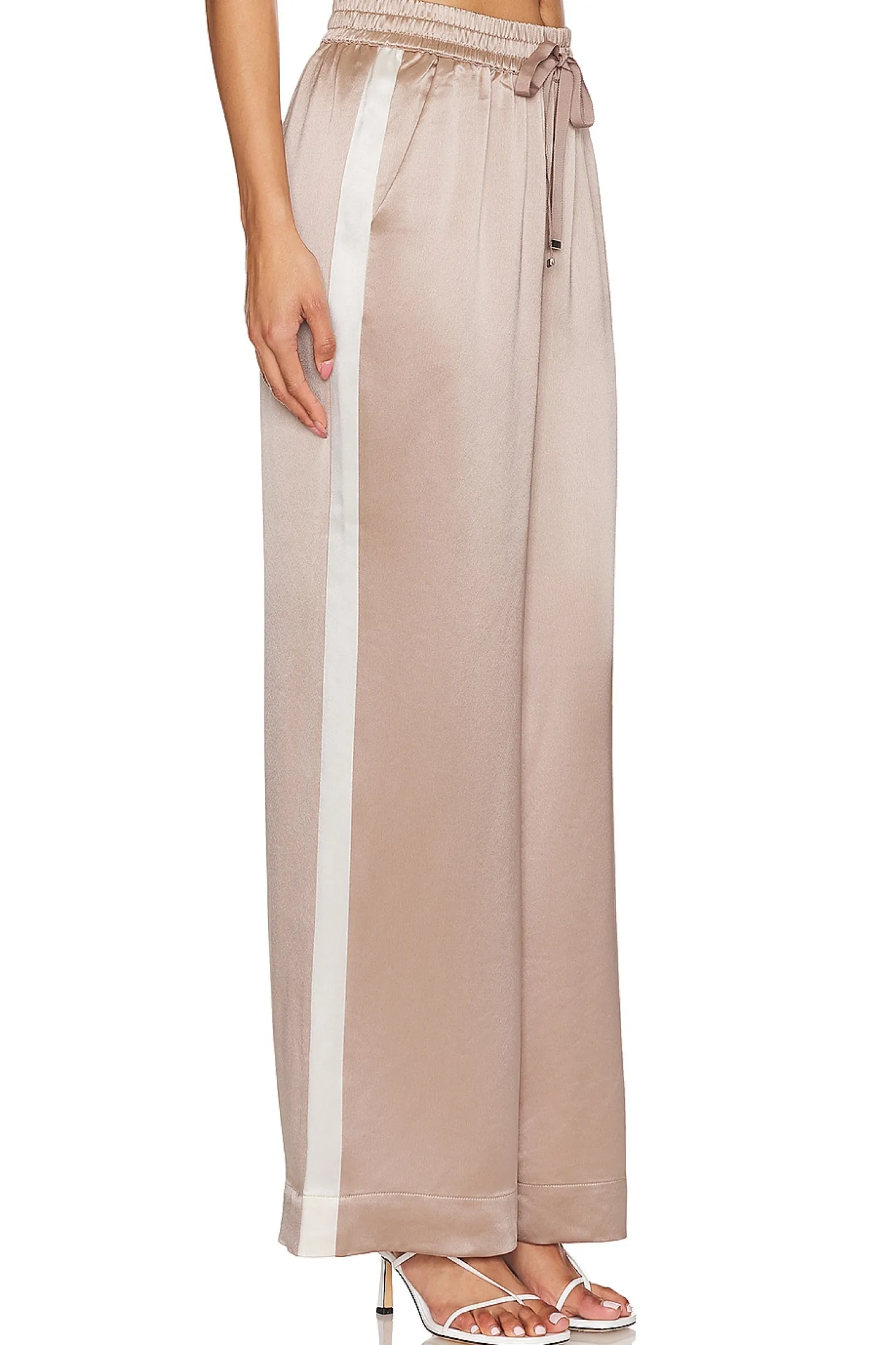 75% acetate 25% polyester.Made in China.Dry clean only.Drawstring closure.Side slant pockets.Midweight satin fabric.21" at the knee and 21" at the leg opening