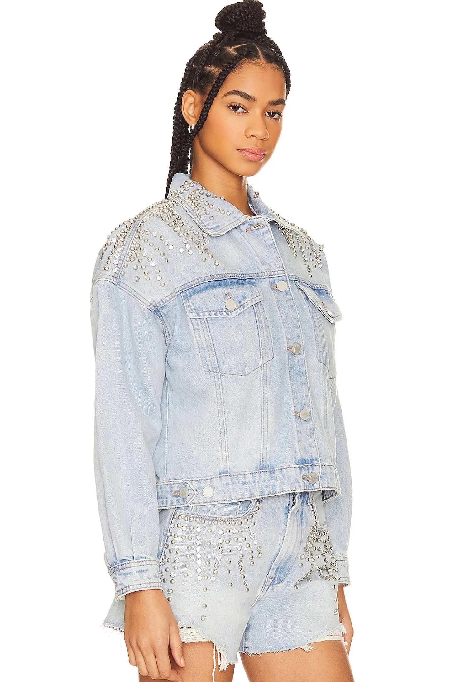 100% cotton.Made in China.Machine wash recommended.Front button closure.Breast flap pockets with button closure.Button cuffs.Silver-tone studs and crystal embellishments.Midweight denim fabric