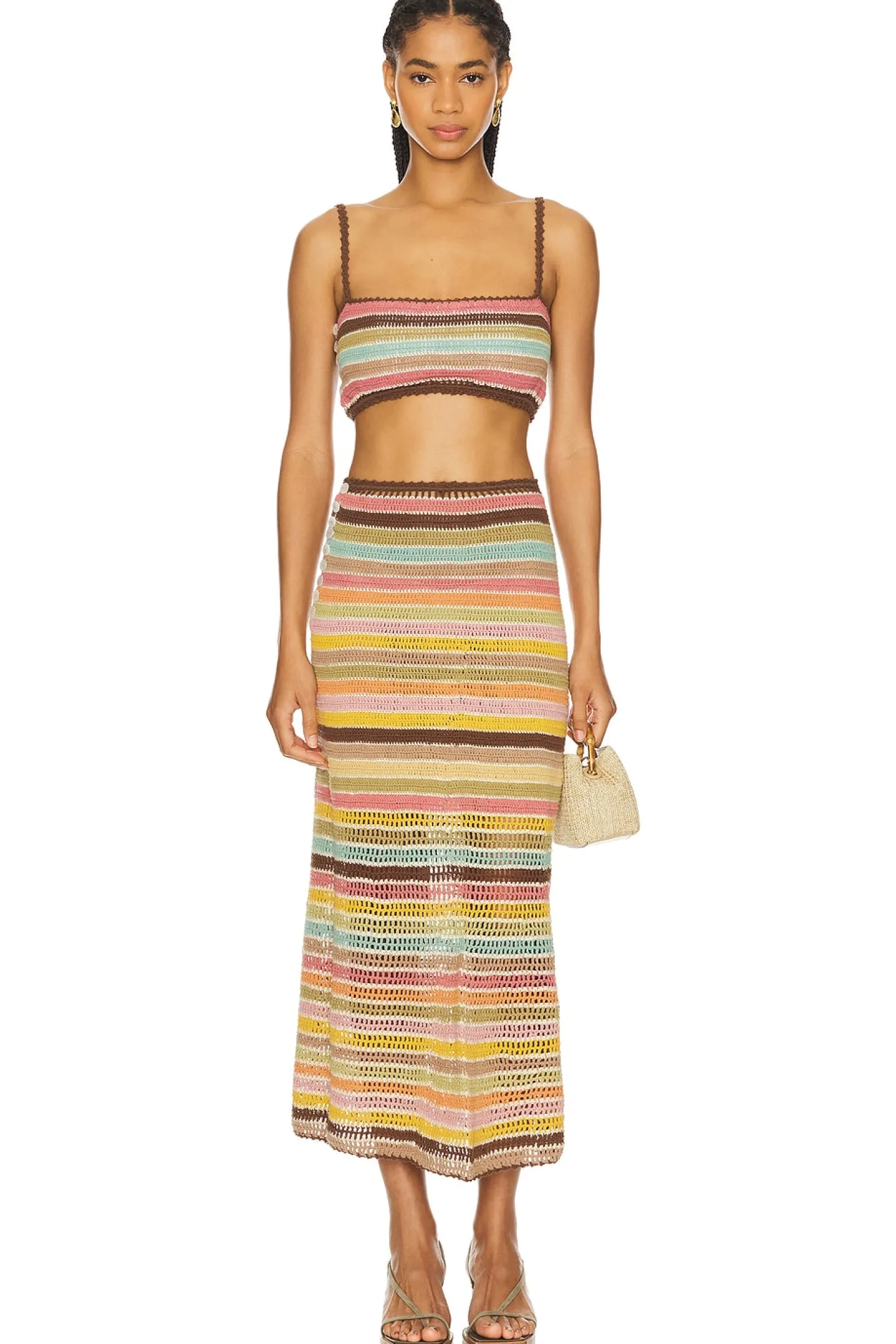 100% cotton.Made in Indonesia.Hand wash.Unlined.Side button closure.Open knit design at lower skirt.Item not sold as a set.Skirt measures approx 37" in length