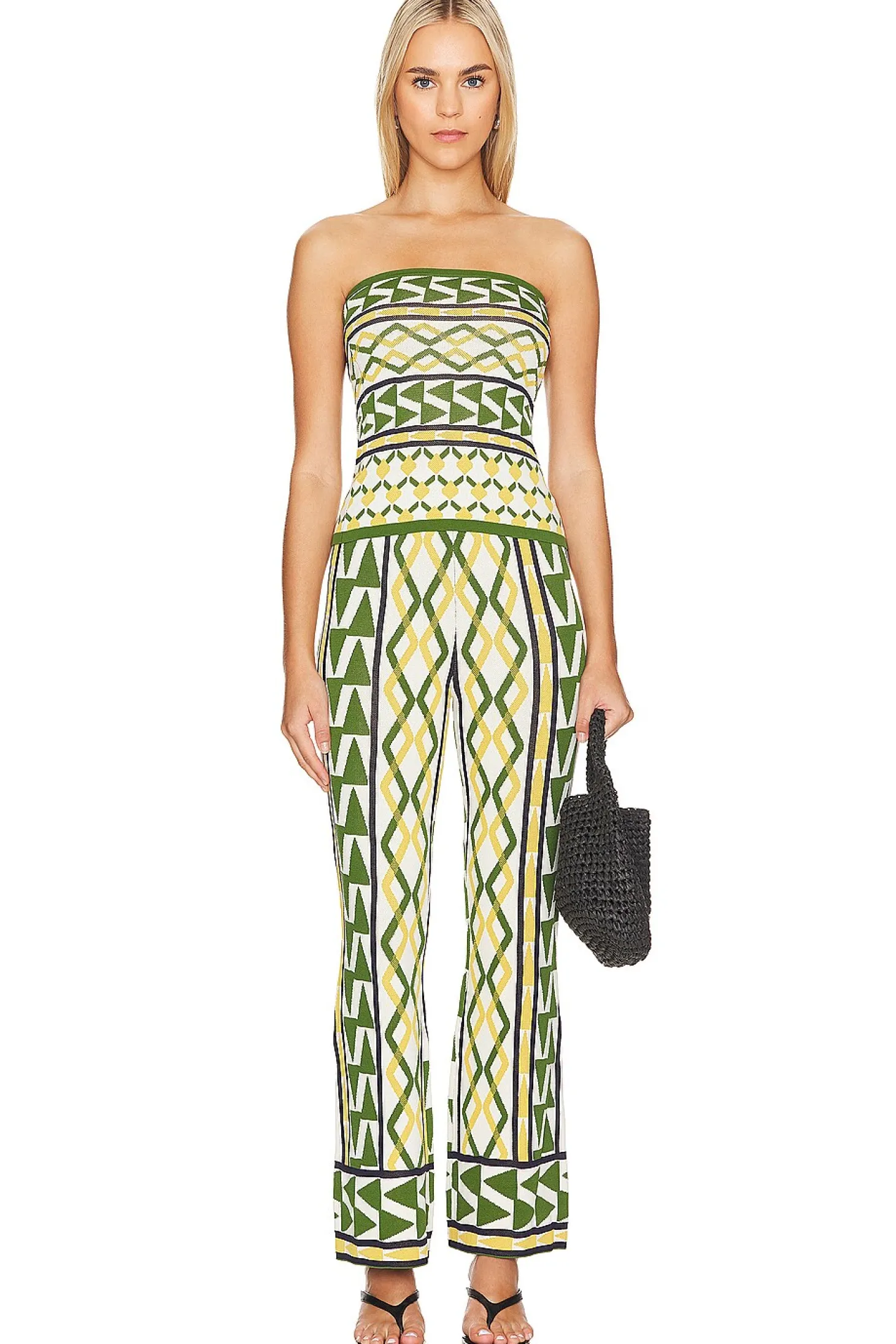 73% viscose 27% polyamide.Made in China.Dry clean only.Pull-on styling with elastic waistband.Midweight jacquard fabric.Item not sold as a set.20" at the knee and 20" at the leg opening