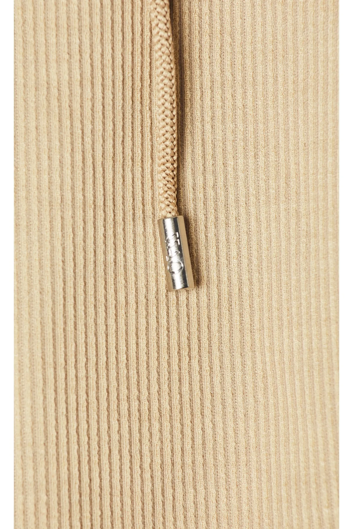 81% polyester 13% rayon 6% spandex.Made in China.Machine wash.Elastic waistband with interior drawstring tie closure.3-pocket styling.19" at the knee narrows to 14" at the leg opening