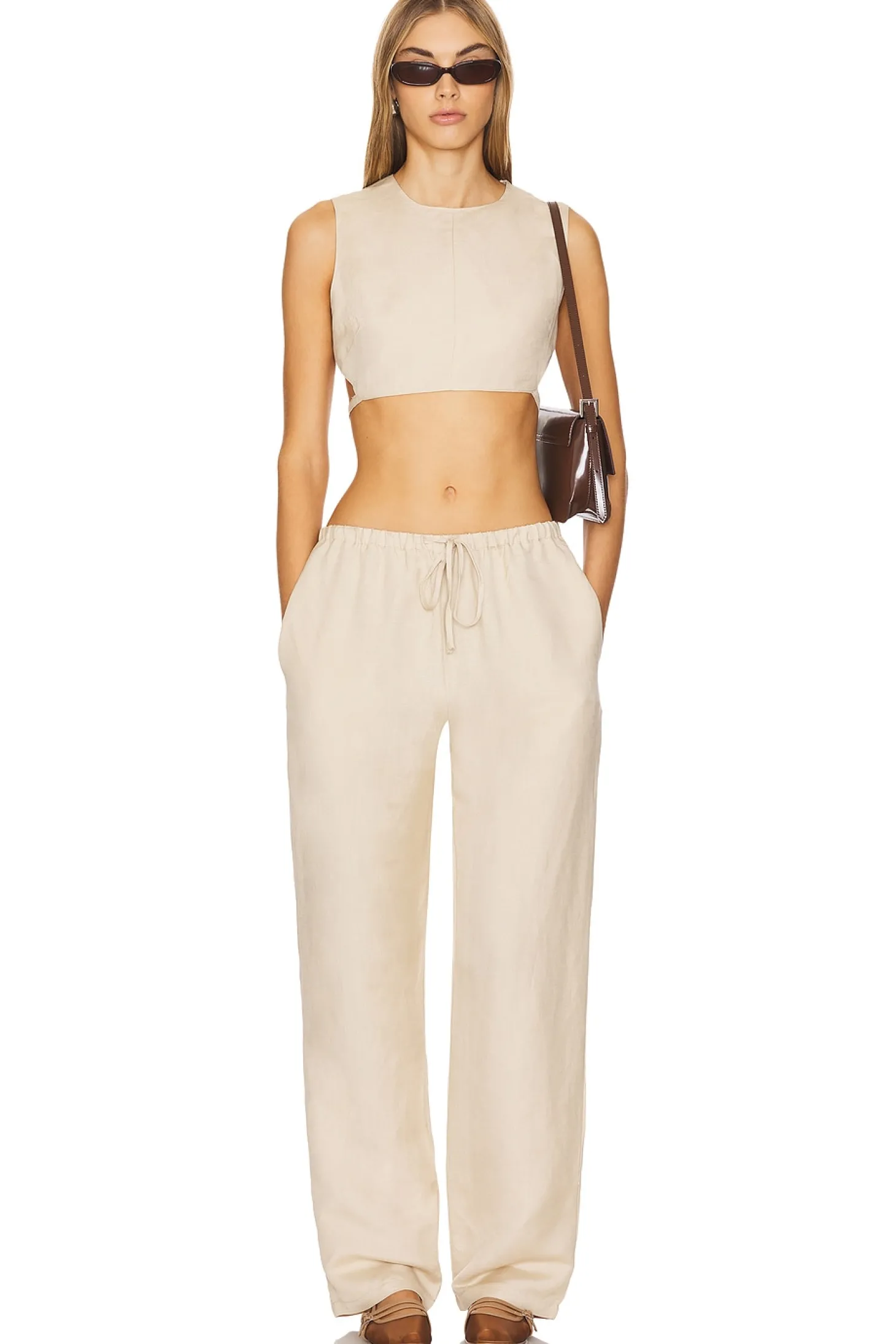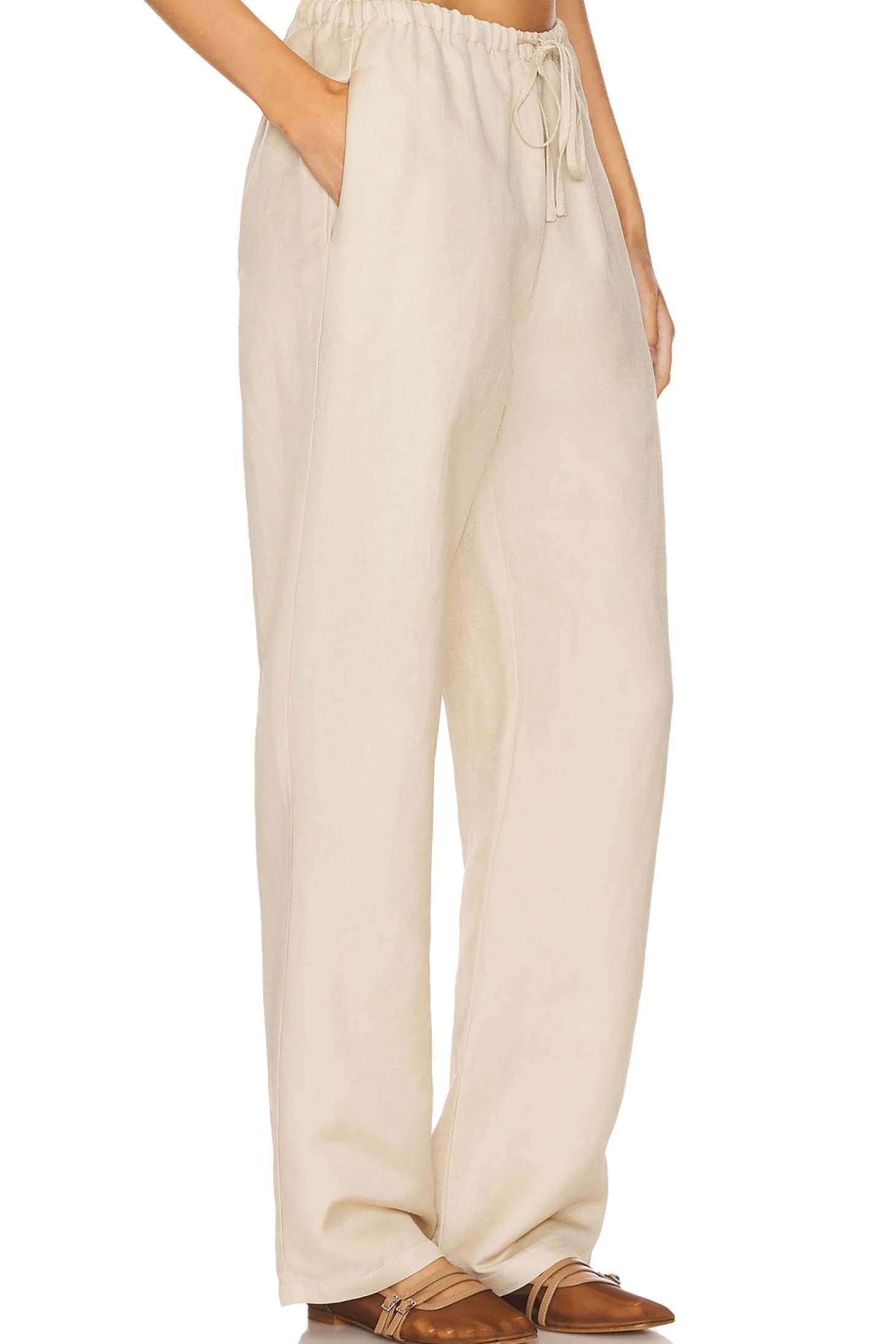 55% linen 45% viscose.Made in China.Hand wash.Elastic waistband and drawstring.Side seam pockets.Linen fabric.Item not sold as set.22" at the knee narrows to 19" at the leg opening