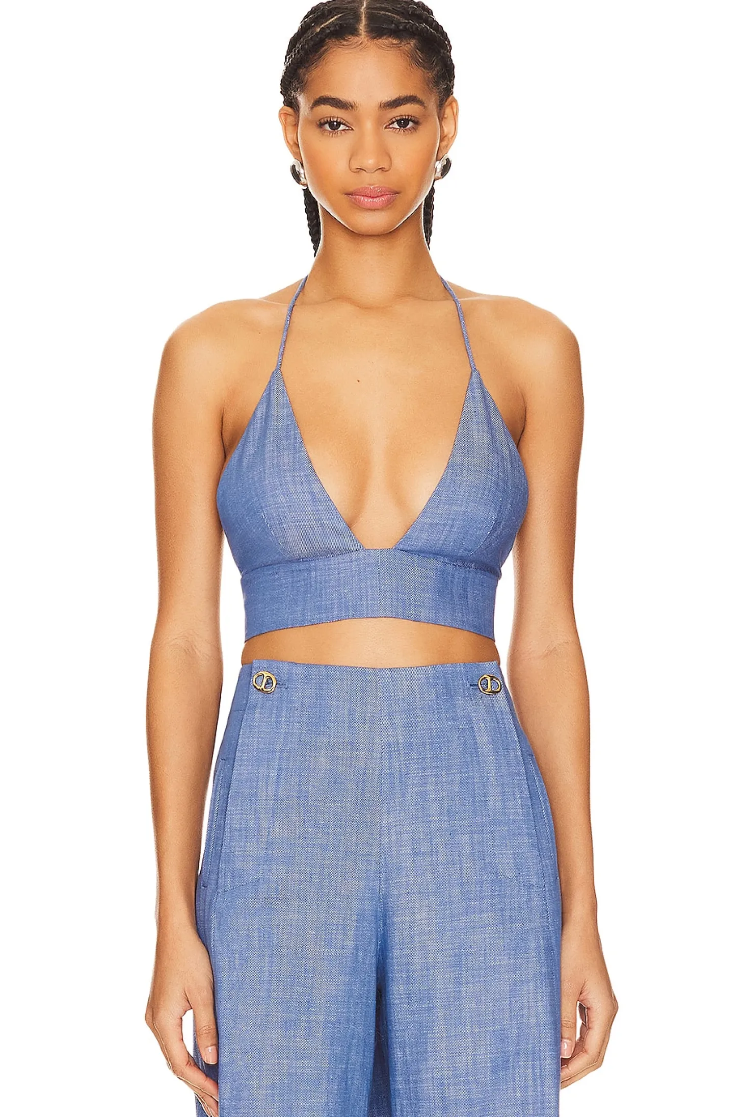 Self: 100% cotton Lining: 100% polyester.Made in China.Dry clean only.Halterneck and back tie closure.Plunging neckline.Lightweight chambray fabric.Item not sold as a set
