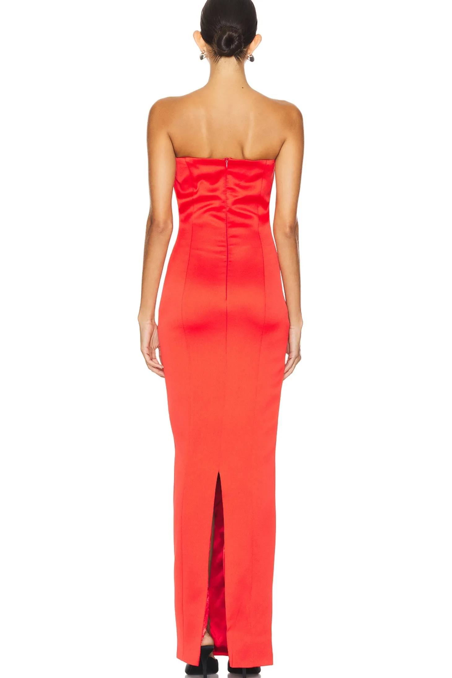 100% polyester.Made in Turkey.Dry clean only.Fully lined.Hidden back zipper closure.Boned bodice with lightly padded cups.Satin fabric with back vent.Neckline to hem measures approx 54" in length