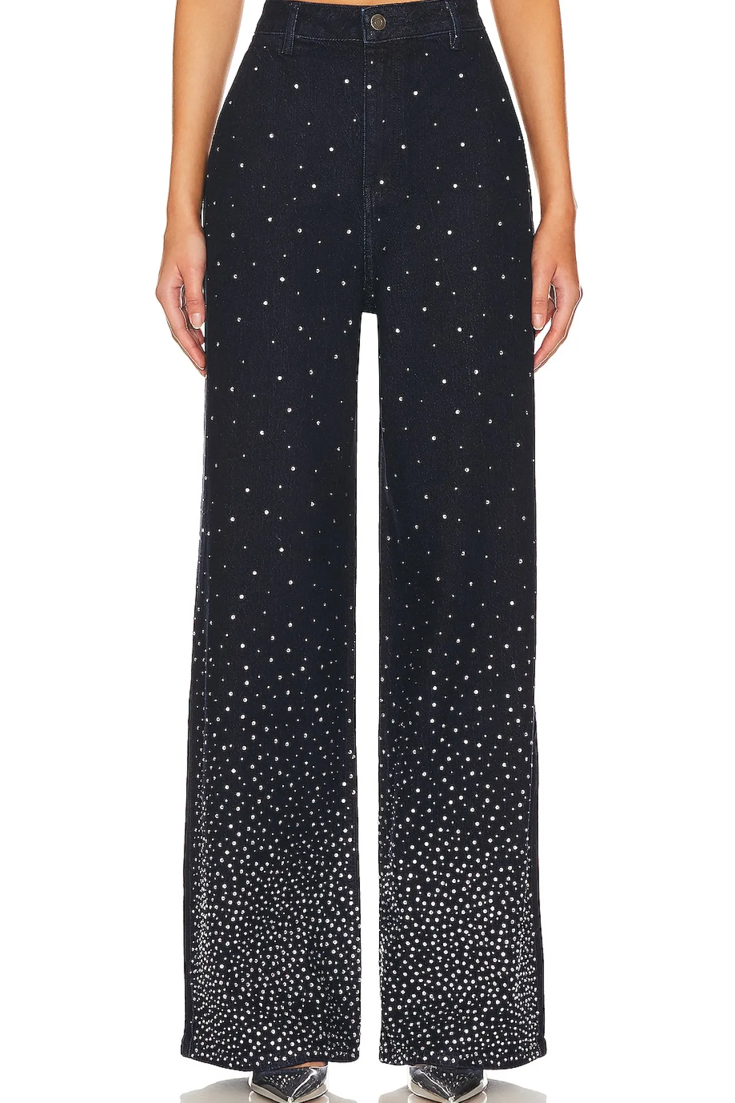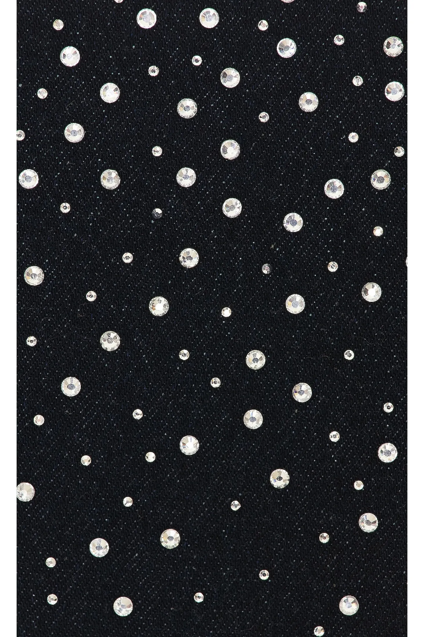 99% cotton 1% spandex.Made in China.Hand wash.Zip fly with button closure.4-pocket styling.Rigid denim with heat-stamped crystals.21" at the knee breaks to 24" at the leg opening