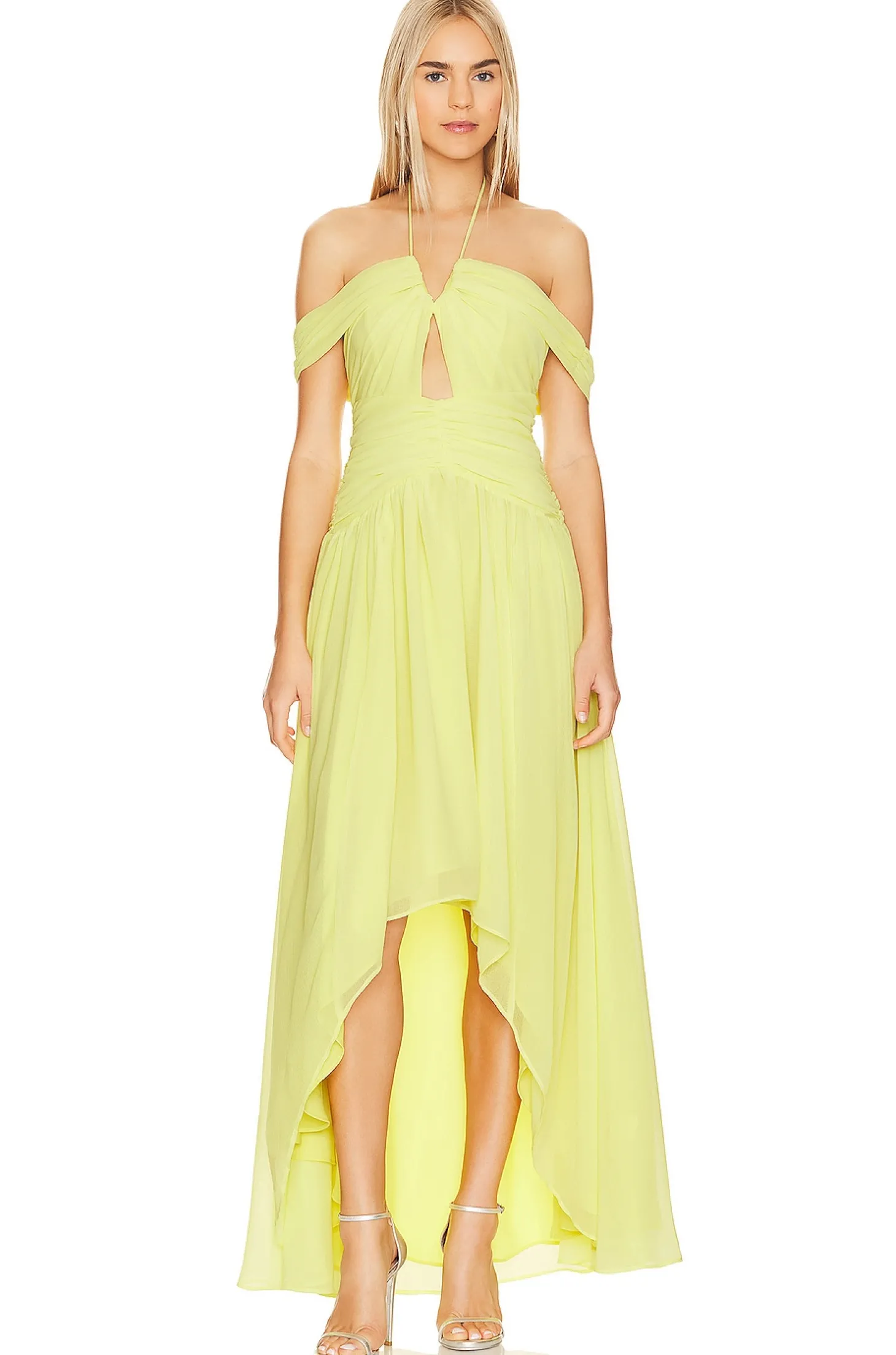 100% polyester.Made in China.Dry clean only.Fully lined.Hidden back zipper closure Halterneck tie closure with V-wire center.Draped off shoulder design Cut-out bust detail.Lightweight crepe fabric overlay with hi-low hem