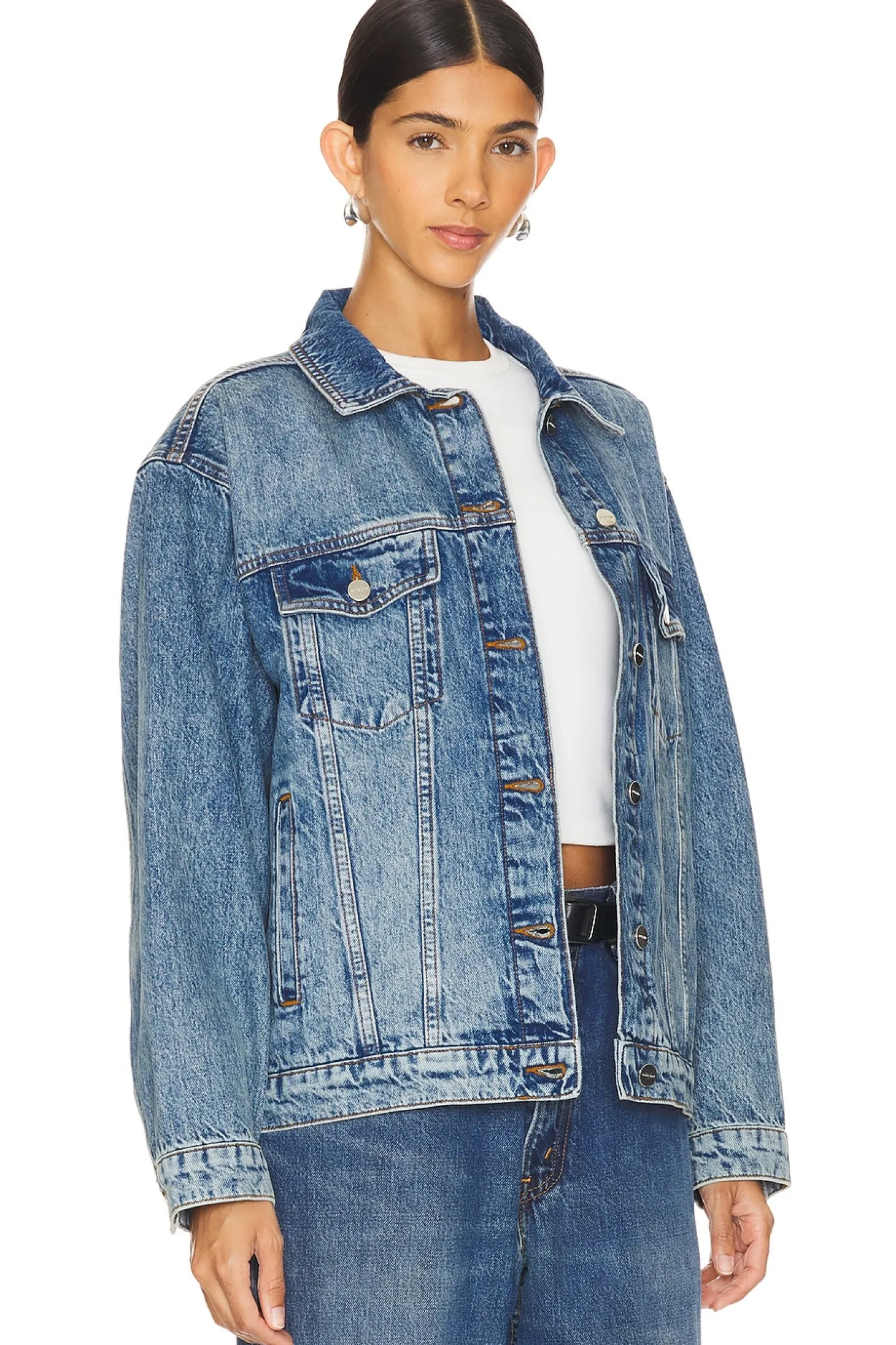 61% cotton 39% organic cotton.Made in Turkey.Machine wash.Front button closure.Side pockets and breast pockets.Rigid denim