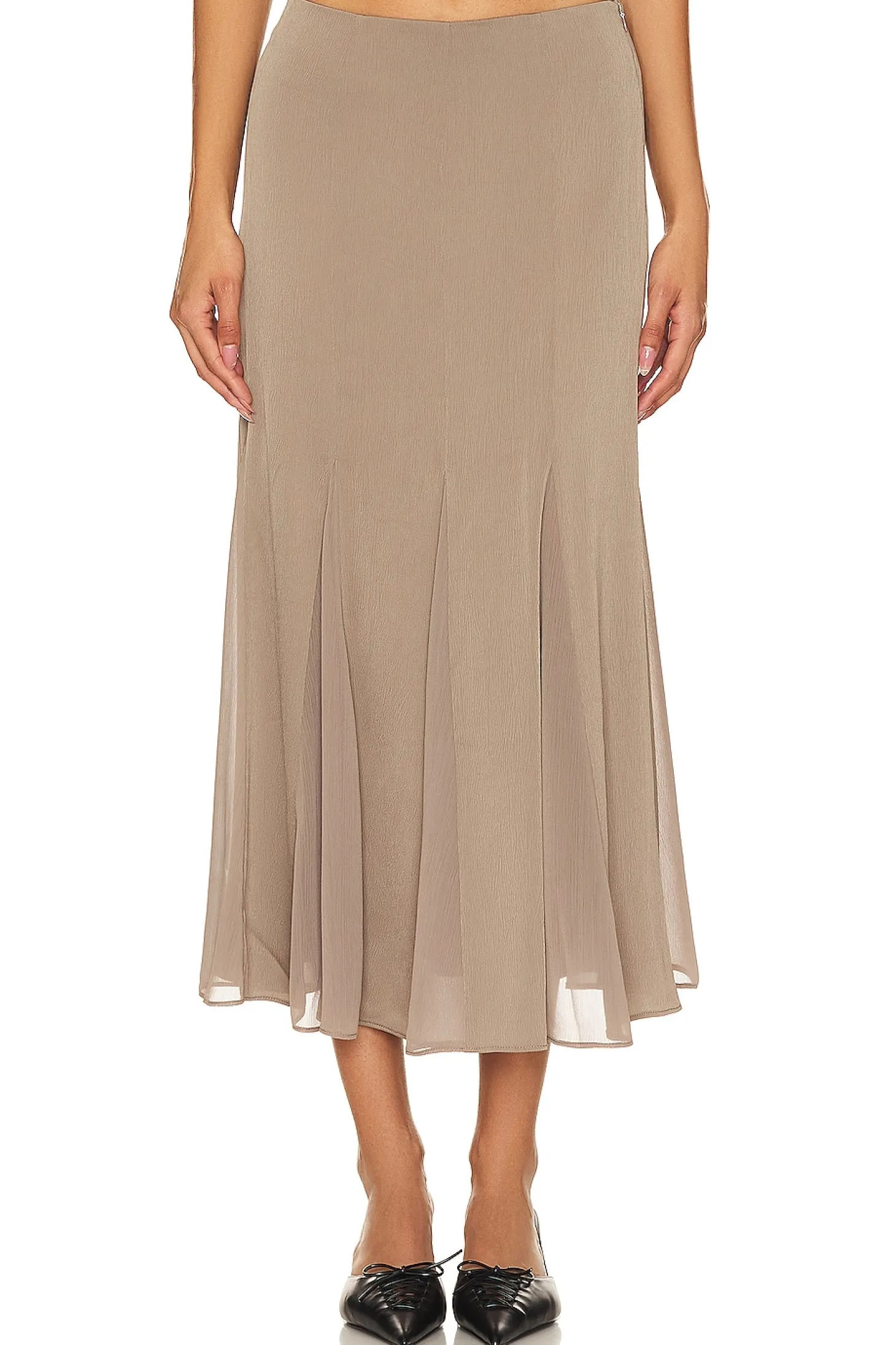 Polyester blend.Imported.Hand wash recommended.Unlined.Hidden side zipper closure.Lightweight crepe fabric with mesh panels.Item not sold as a set.Skirt measures approx 33" in length