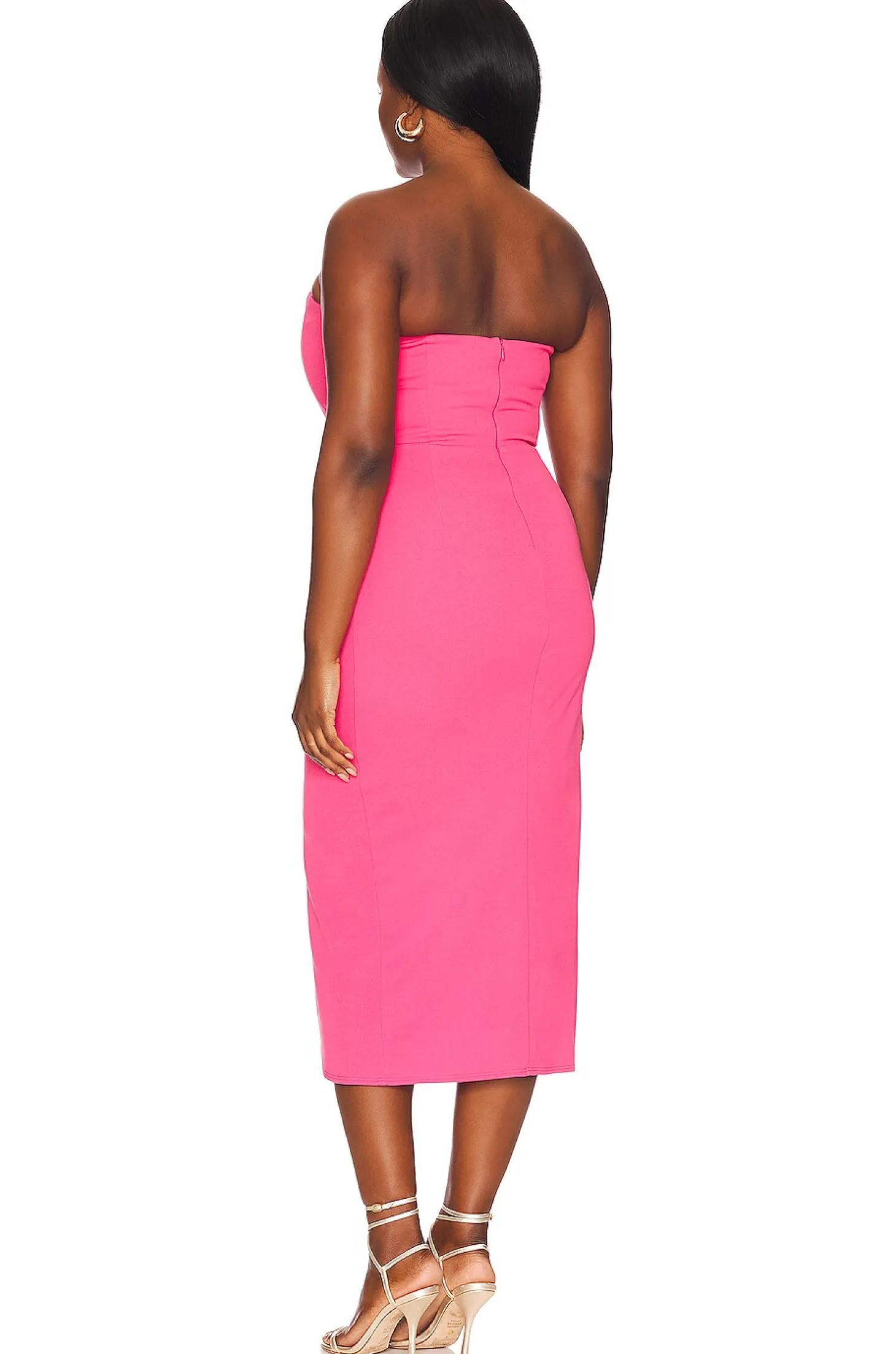 Self: 97% polyester 3% spandex Lining: 100% polyester.Made in USA.Dry clean only.Fully lined.Hidden back zipper closure.Boned bodice with non-slip silicone grip lining at neckline Crepe fabric with cascading ruffle detail at side seam slit.Model 1 is wearing size S Model 2 is wearing size S.Neckline to hem measures approx 44" in length