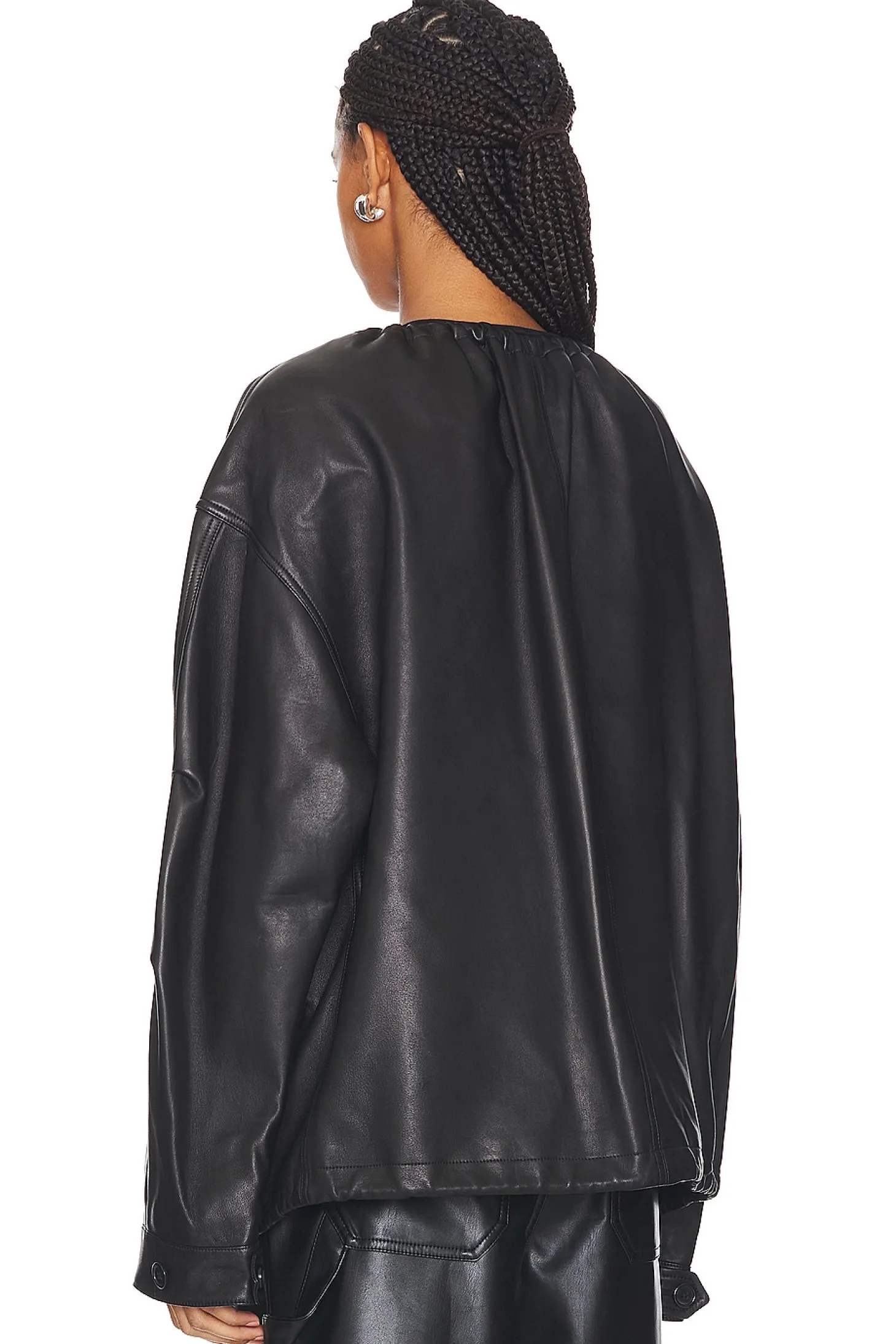 Self: 100% leather Lining: 100% viscose.Made in India.Pro Leather clean only.Front zipper closure.Draw String at neck and waistline.Side flap pockets