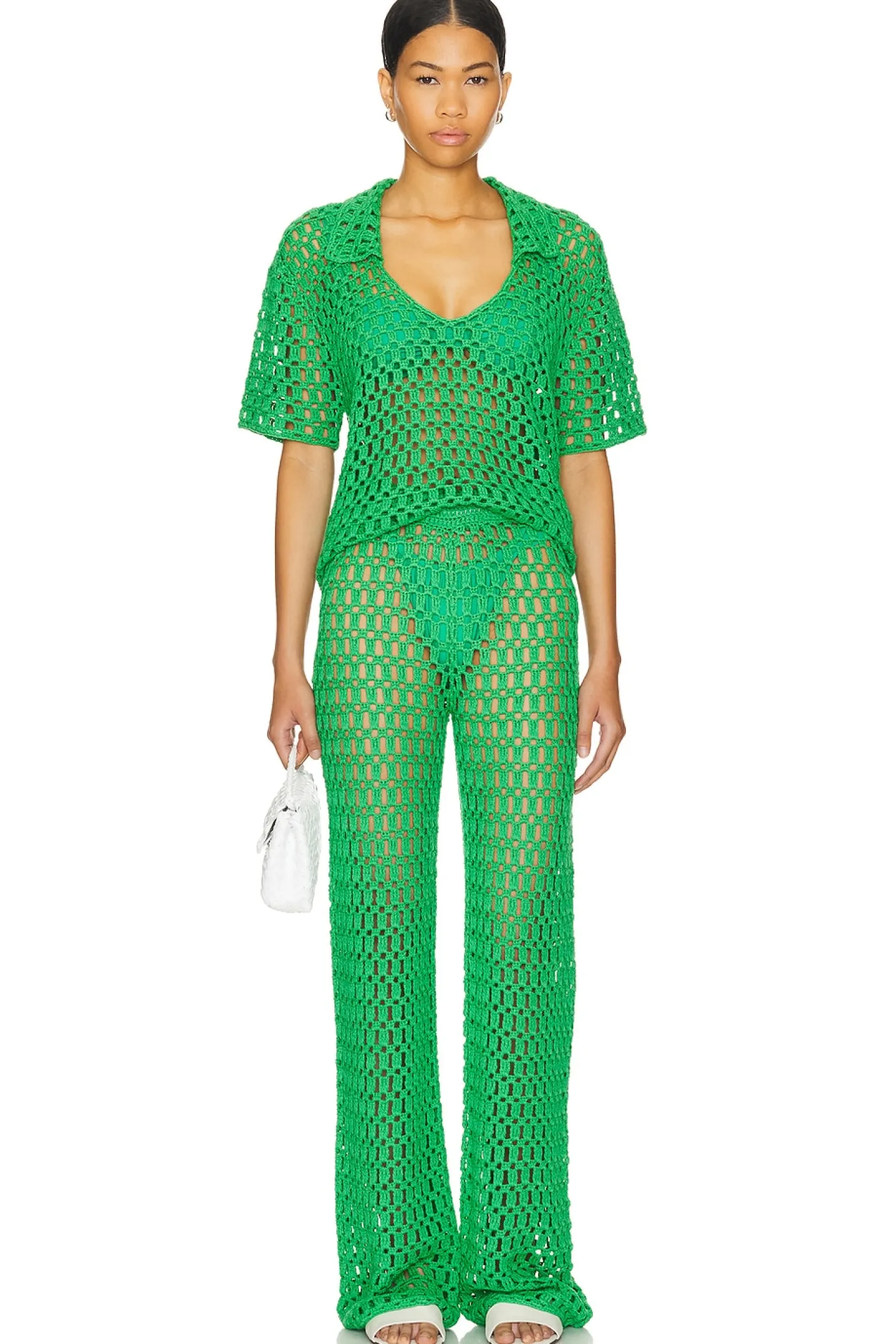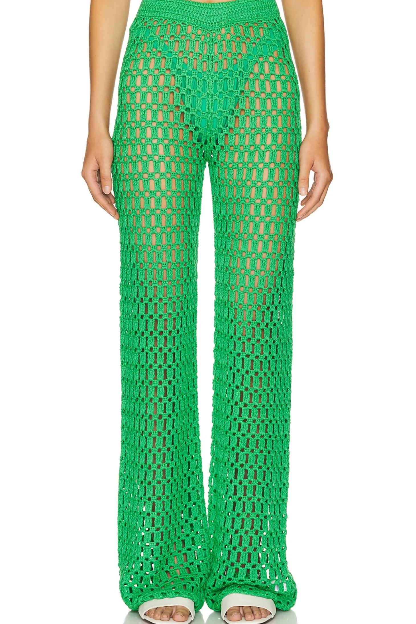 100% acrylic.Made in China.Hand wash.Elastic waistband.Open knit crochet fabric.Please note: Garment is intentionally sheer, undergarments will show through. Please note undergarment not included..Item not sold as a set.18" at the knee and 18" at the leg opening
