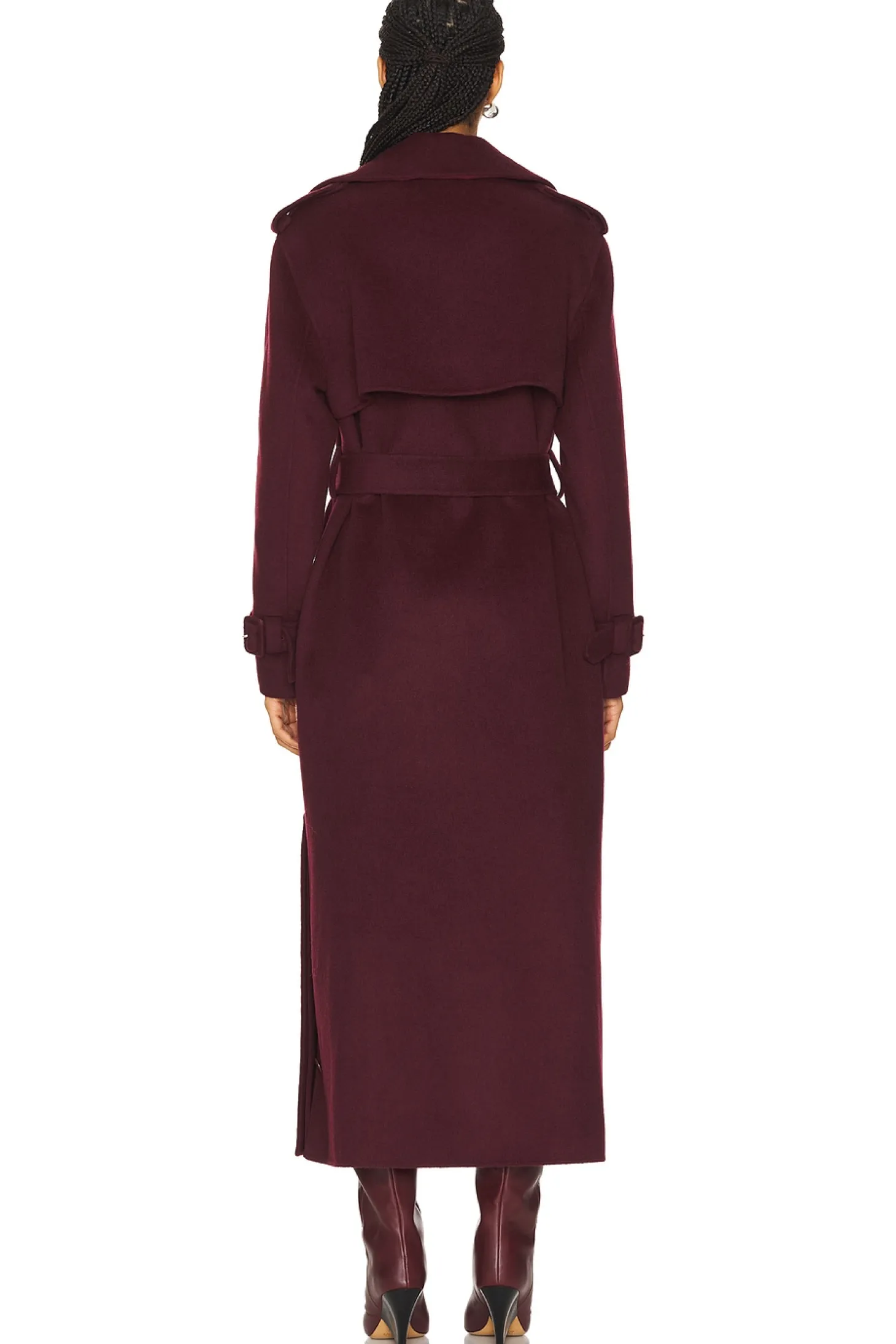 Self: 50% wool 50% polyester Lining: 100% polyester.Made in China.Dry clean only.Dual-breasted front button closure.Side slant pockets.Button cuffs.Detachable melton waist belt.Melton fabric