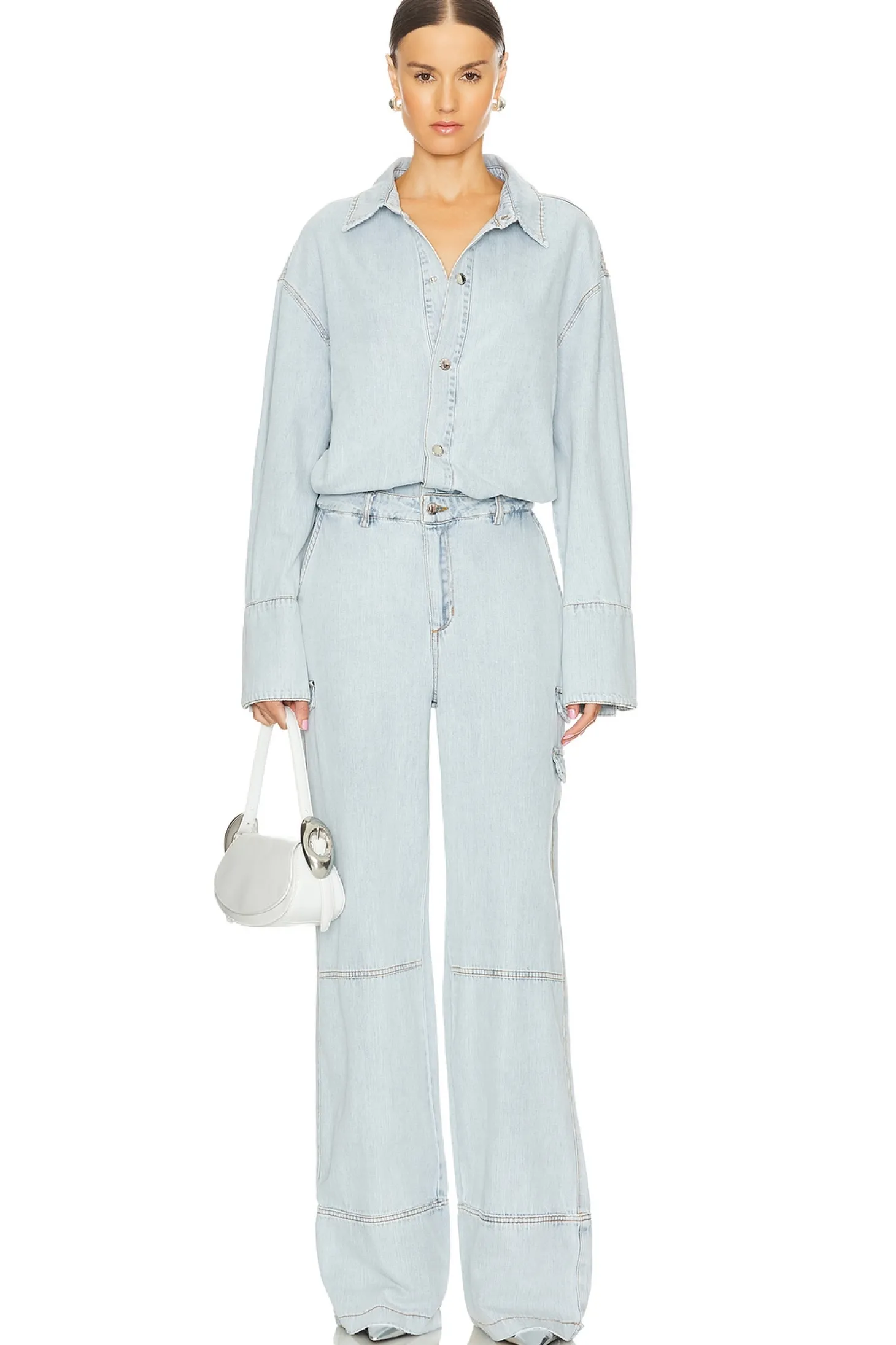 100% cotton.Made in China.Machine wash.Front button closure with button cuffs and hem.Zip fly with button closure.4-pocket styling 3 flaps.Rigid denim with detachable belt