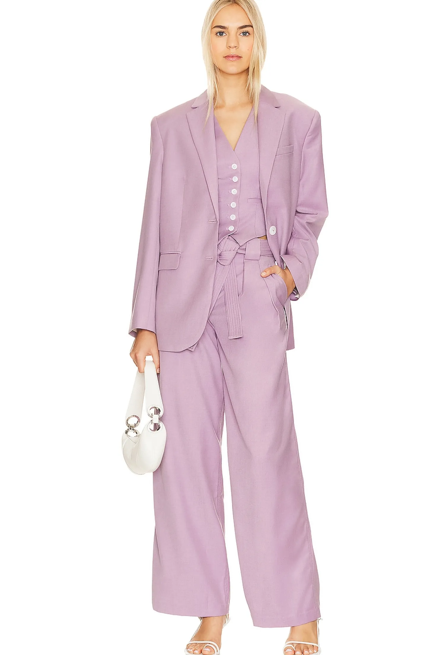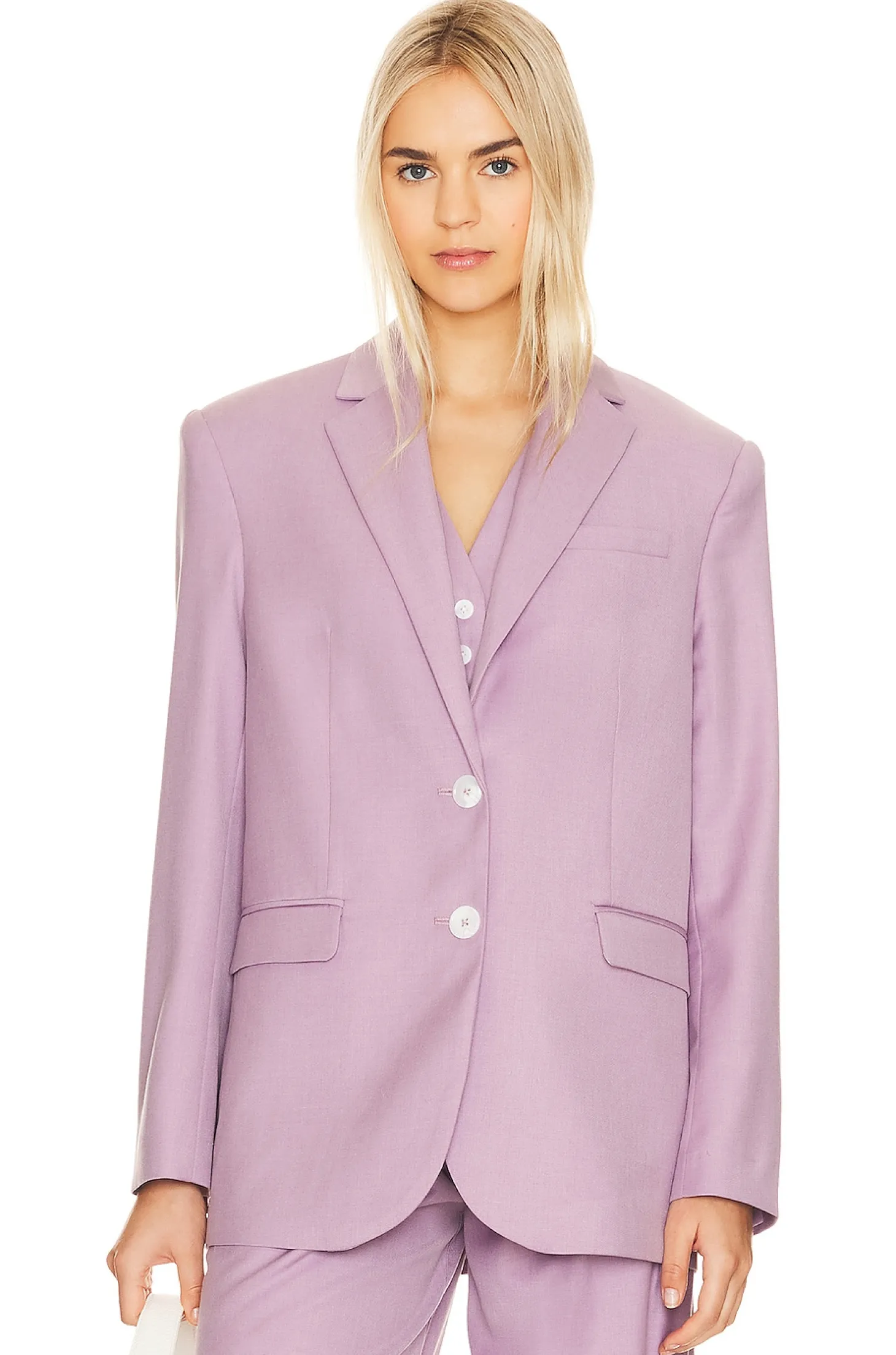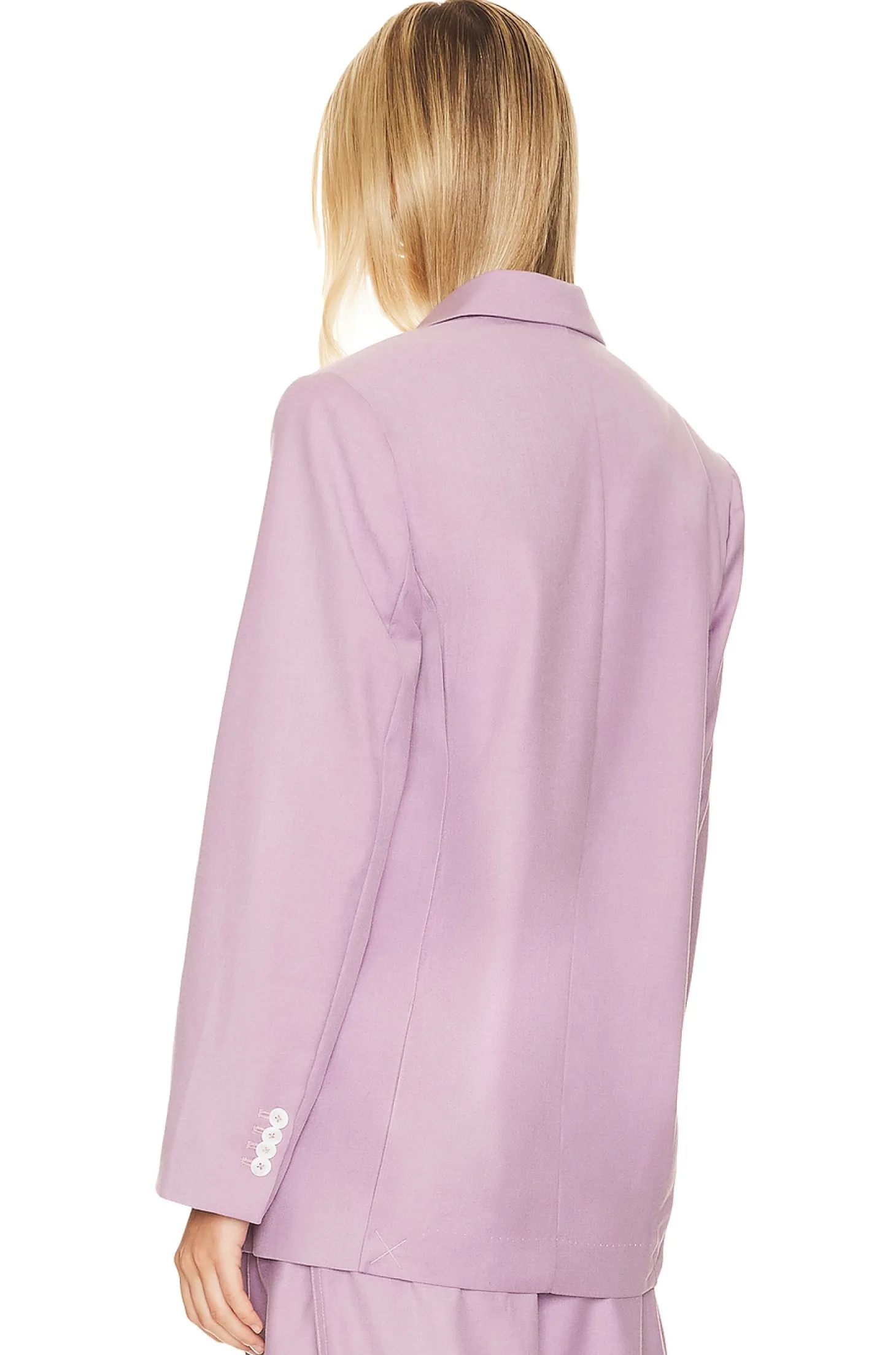 Self: 78% polyester 22% rayon Lining: 55% polyester 45% rayon.Made in China.Dry clean only.Dual front button closure.Padded shoulders.Front flap pockets.Buttoned cuffs.Suiting fabric Item not sold as a set