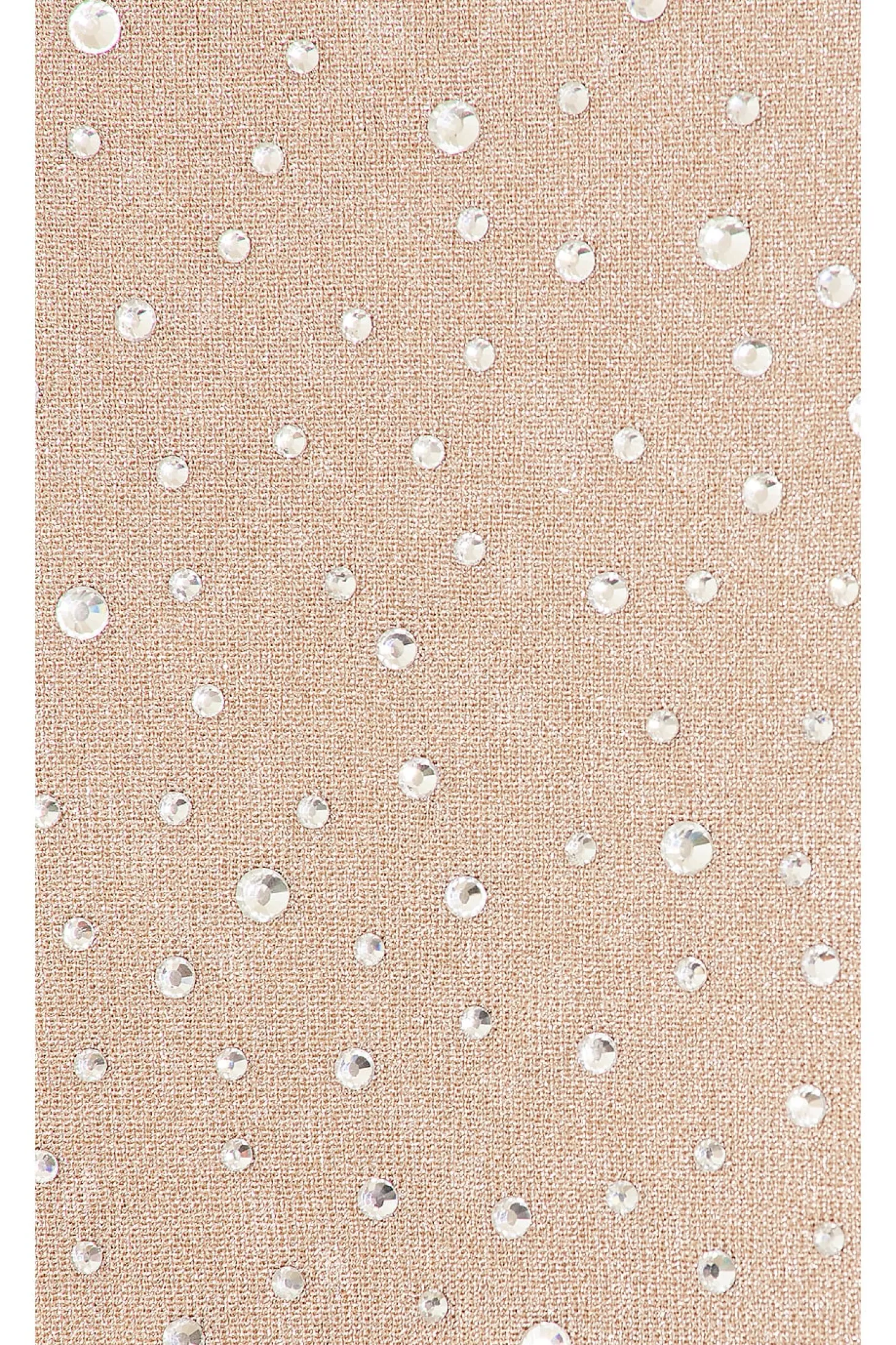 75% nylon 25% polyester.Made in China.Dry clean only.Unlined.Halterneck and back tie closure.Cowl neckline.Jersey fabric with metallic threading and rhinestone embellishments throughout