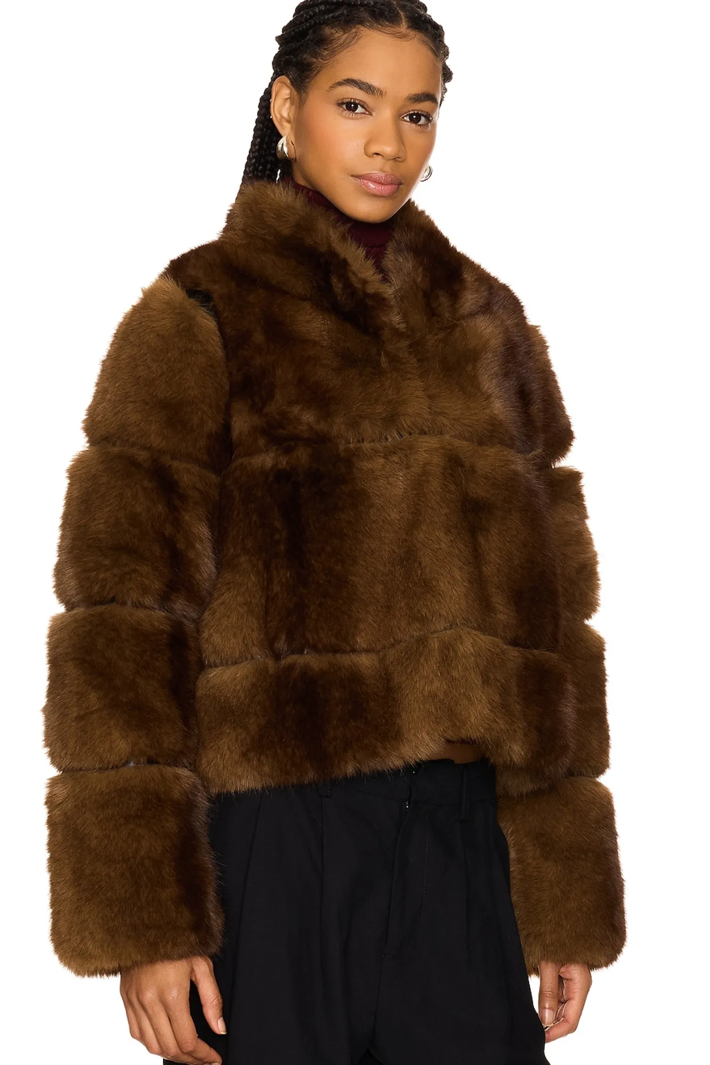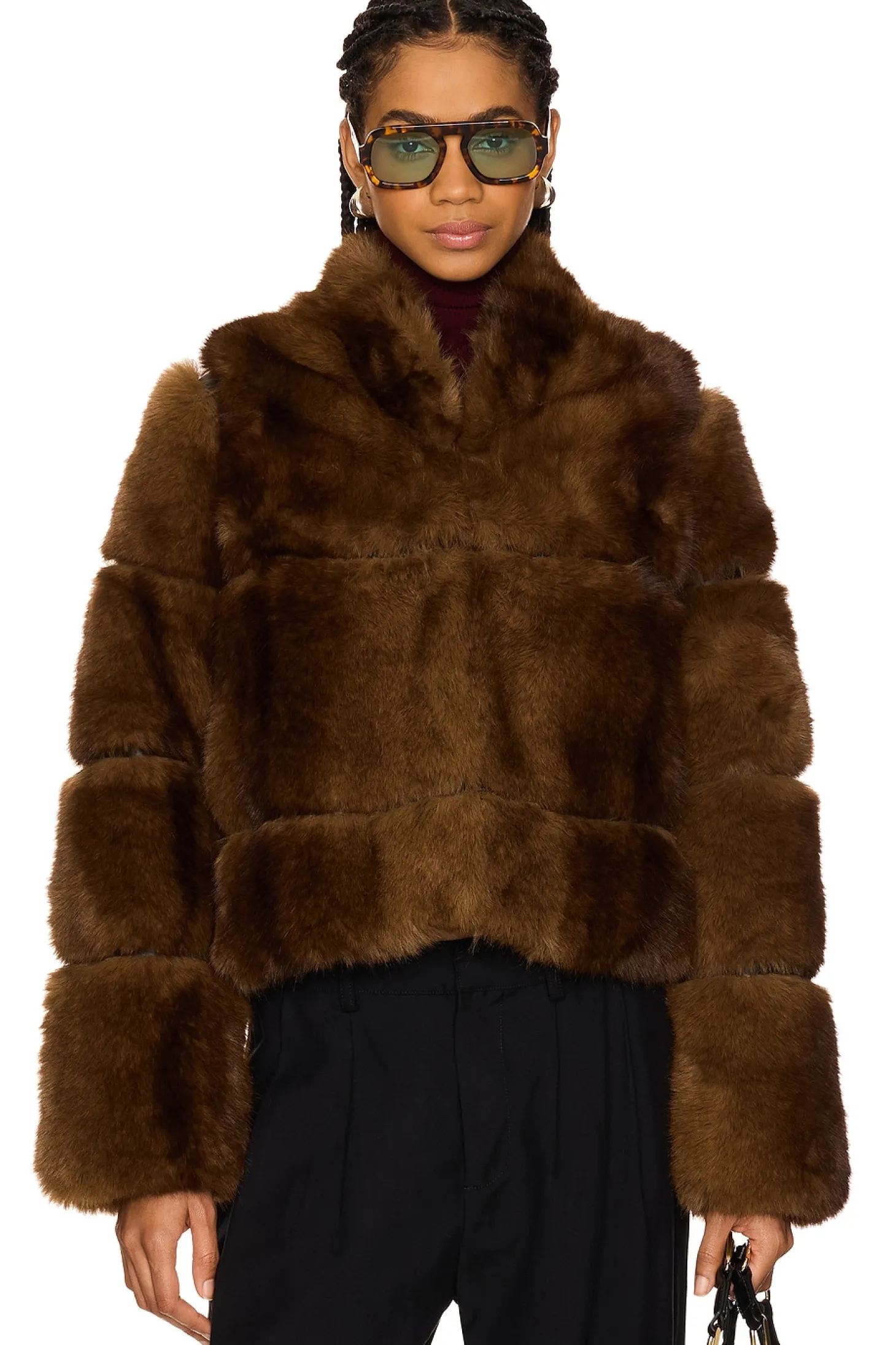 Self & Lining: 100% recycled polyester.Made in China.Dry clean only.Front hook and eye closure.Cropped styling.Heavyweight faux fur fabric