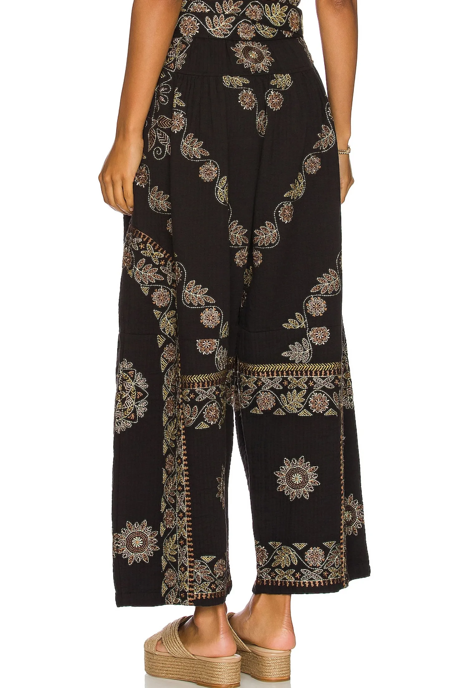 Self: 100% cotton Embroidery 100% viscose.Made in India.Hand wash.Elastic waistband with detachable waist tie closure.Side slant pockets.Embroidery detail throughout.30" at the knee narrows to 24" at the leg opening
