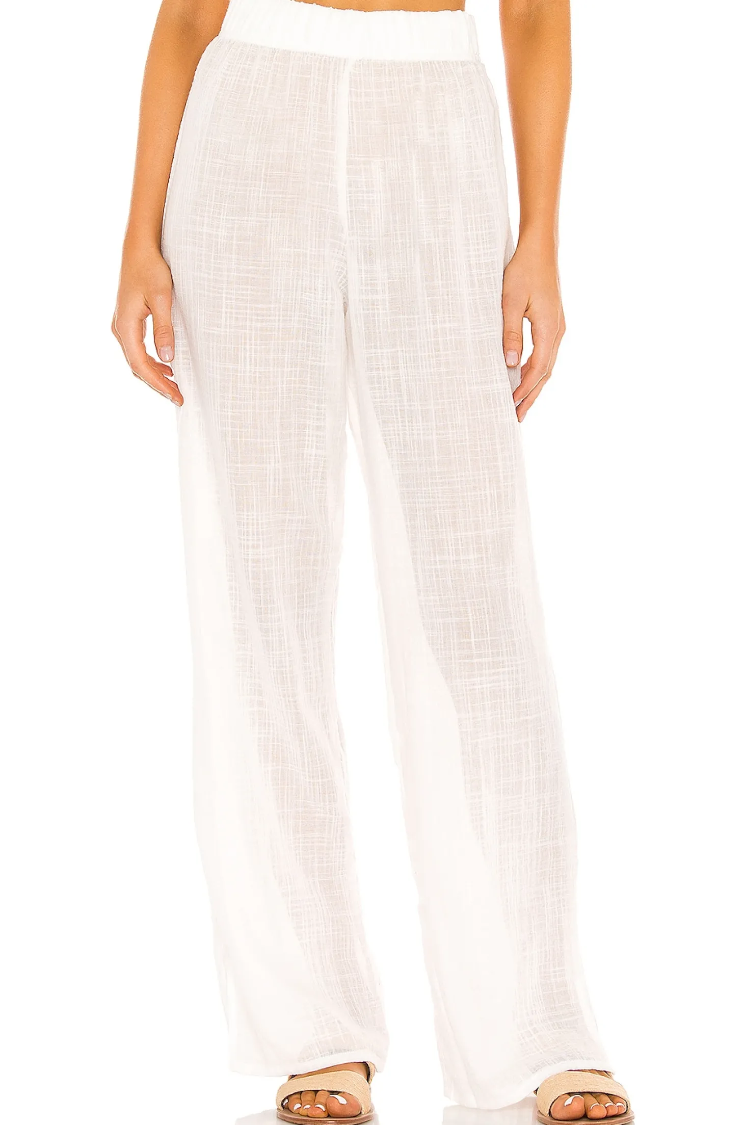 67% cotton 33% viscose.Hand wash cold.Elastic waistband.Semi-sheer fabric.Slit cuffs.Item not sold as a set.18" at the knee and 18" at the leg opening.Made in Columbia