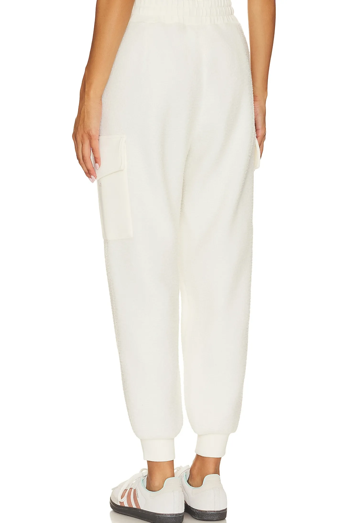 Self: 100% recycled polyester Contrast fabric: 72% polyester 23% polyester 5% elastane .Made in China.Hand wash recommended.Pull-on styling with elastic waistband.Cargo pockets.Lightweight fleece fabric.Item not sold as a set.16" at the knee narrows to 9" at the leg opening