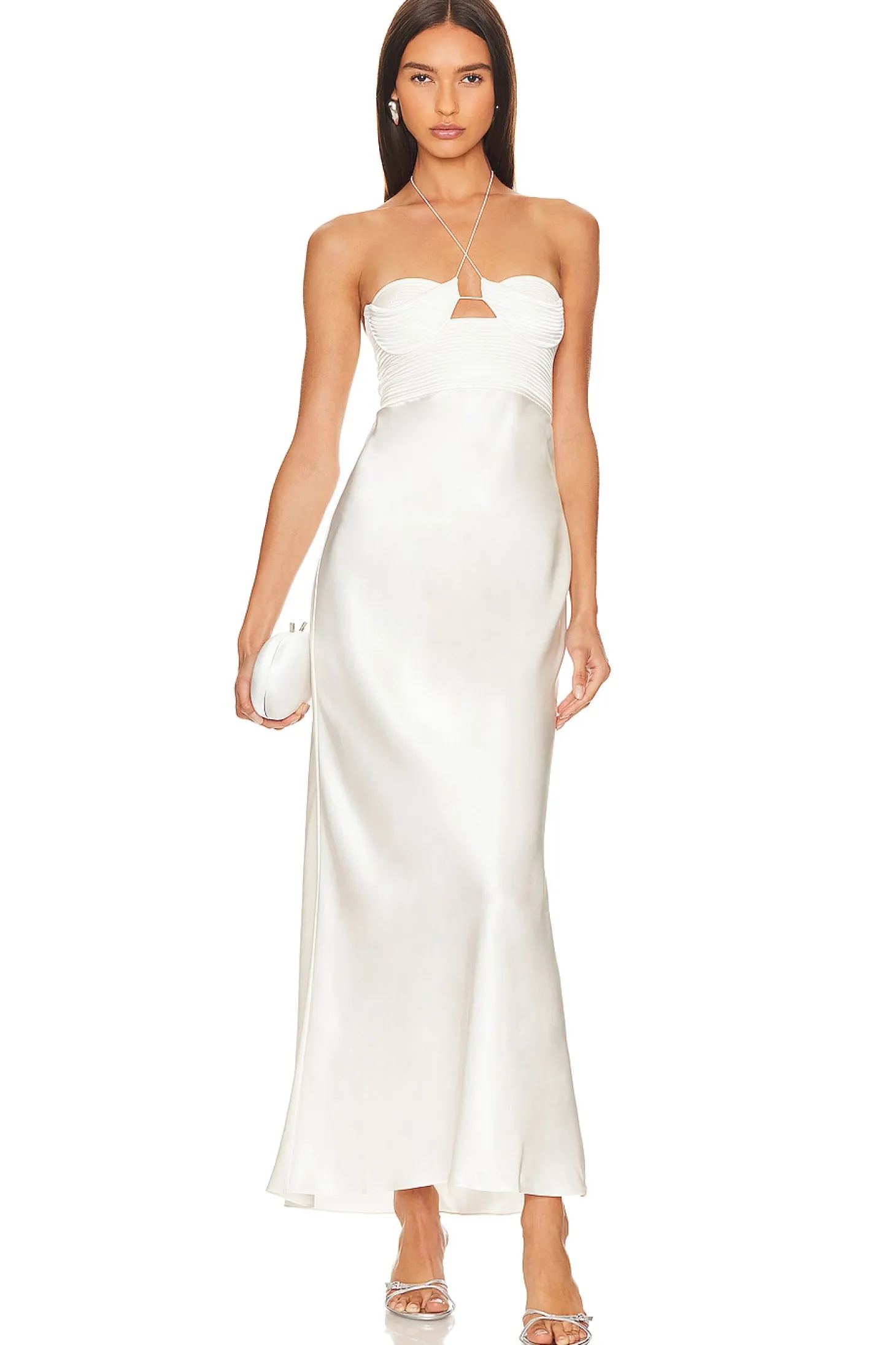 70% viscose 30% polyester.Made in Ukraine.Dry clean only.Unlined.Hidden side zipper closure.Unpadded underwire cups Halterneck tie closure.Quilted fabric bodice with satin skirt.Neckline to hem measures approx 49" in length