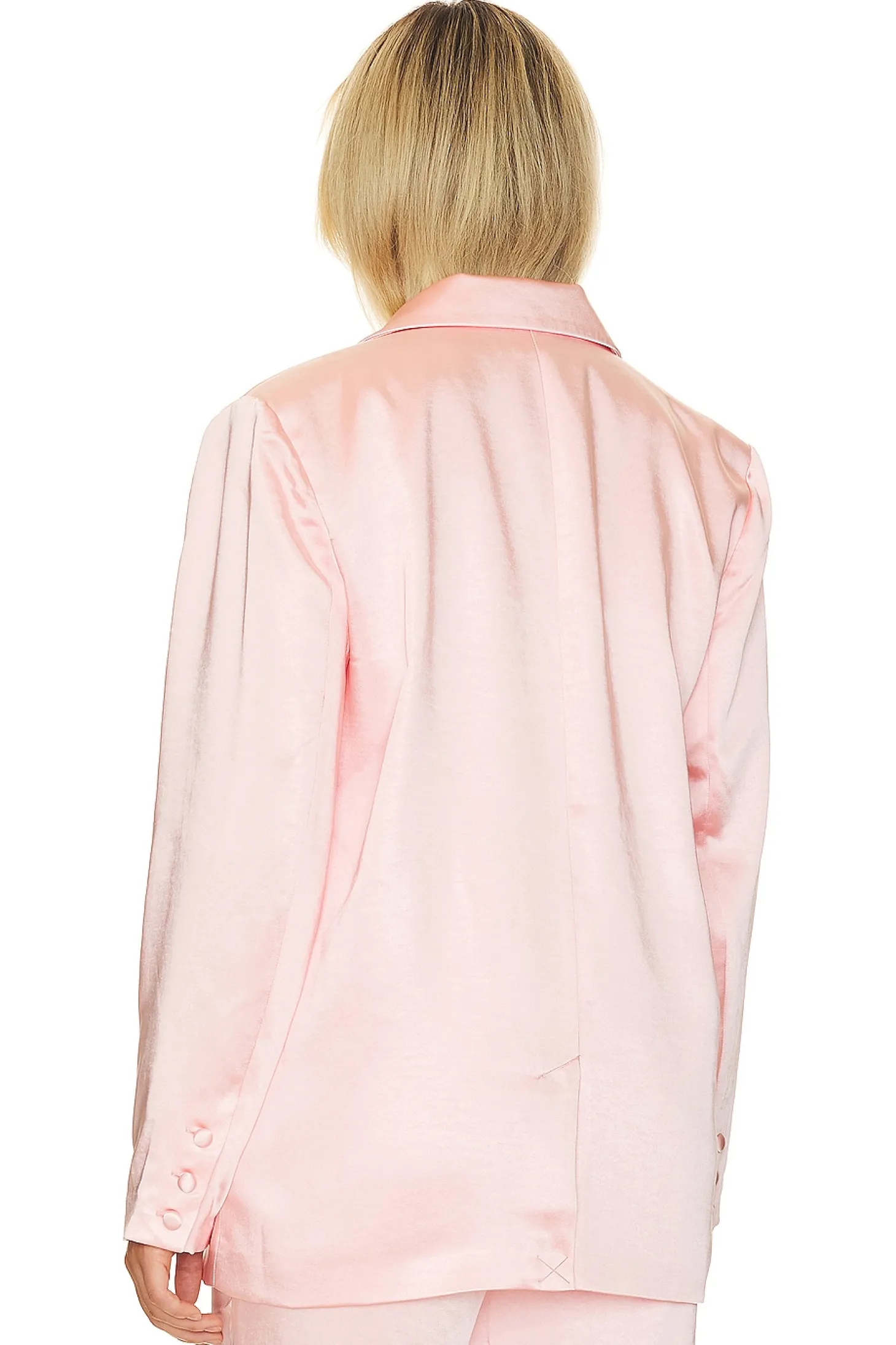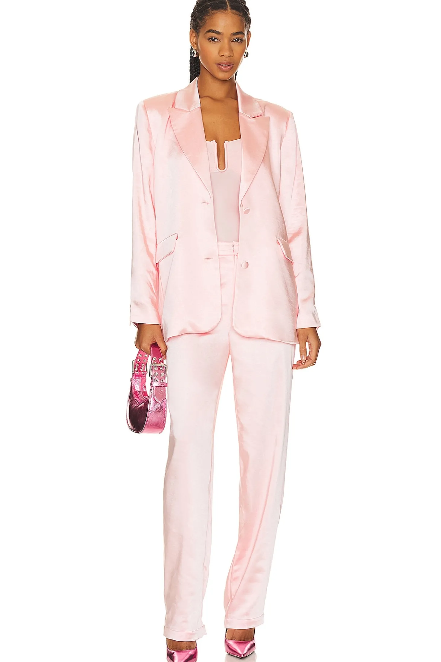 Self: 100% polyester Lining: 97% polyester 3% elastane.Made in China.Hand wash.Front button closure with button cuffs.Padded shoulders with button cuffs.Front tab pockets Satin fabric with back vent.Model 1 is wearing size 1 Model 2 is wearing size 3.Item not sold as set
