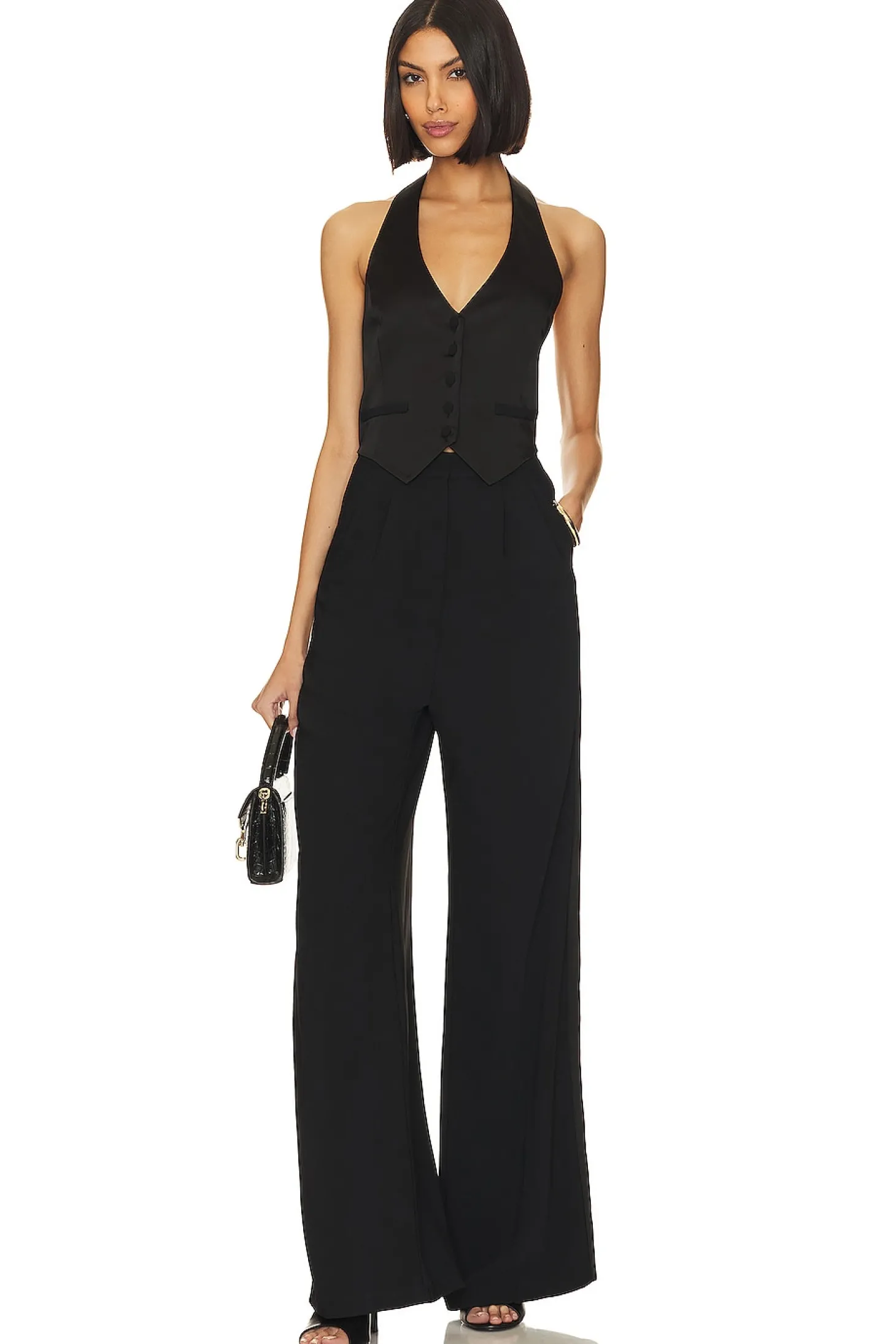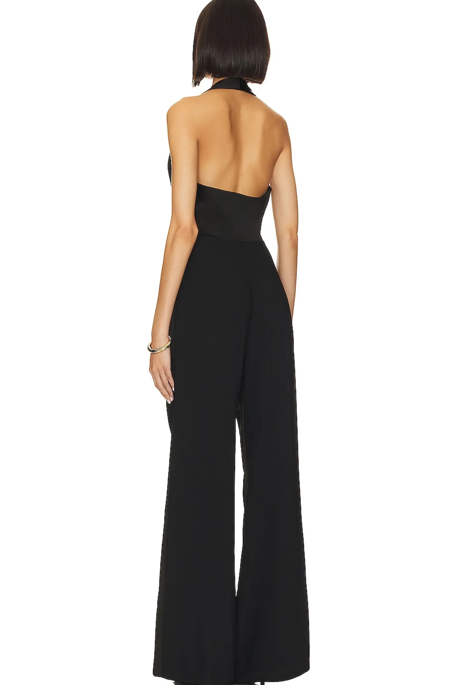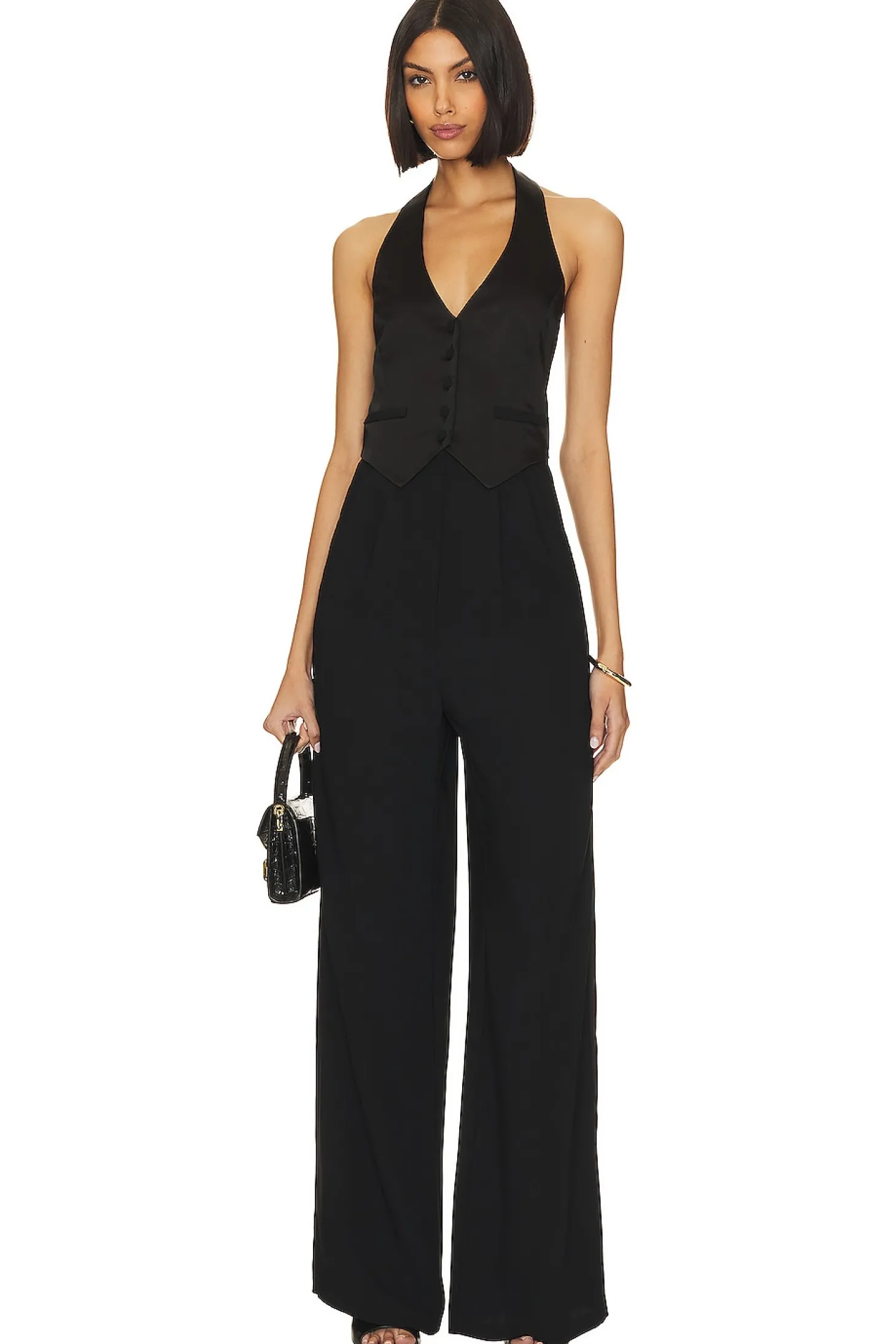 Discover the Amanda Uprichard Satin Isadore Jumpsuit in Black. This piece masterfully combines a satin vest with an attached suiting pant, offering a formal flare that demands attention. Its alluring open back and halter styling radiate a bend of elegance and edginess. Dive into upscale sophistication while flaunting impeccable style. Perfect for the modern fashionista..100% polyester.Made in China.Machine wash.Front button closure and zip fly with hook and bar closure.Side slant pockets.Satin vest with twill pants