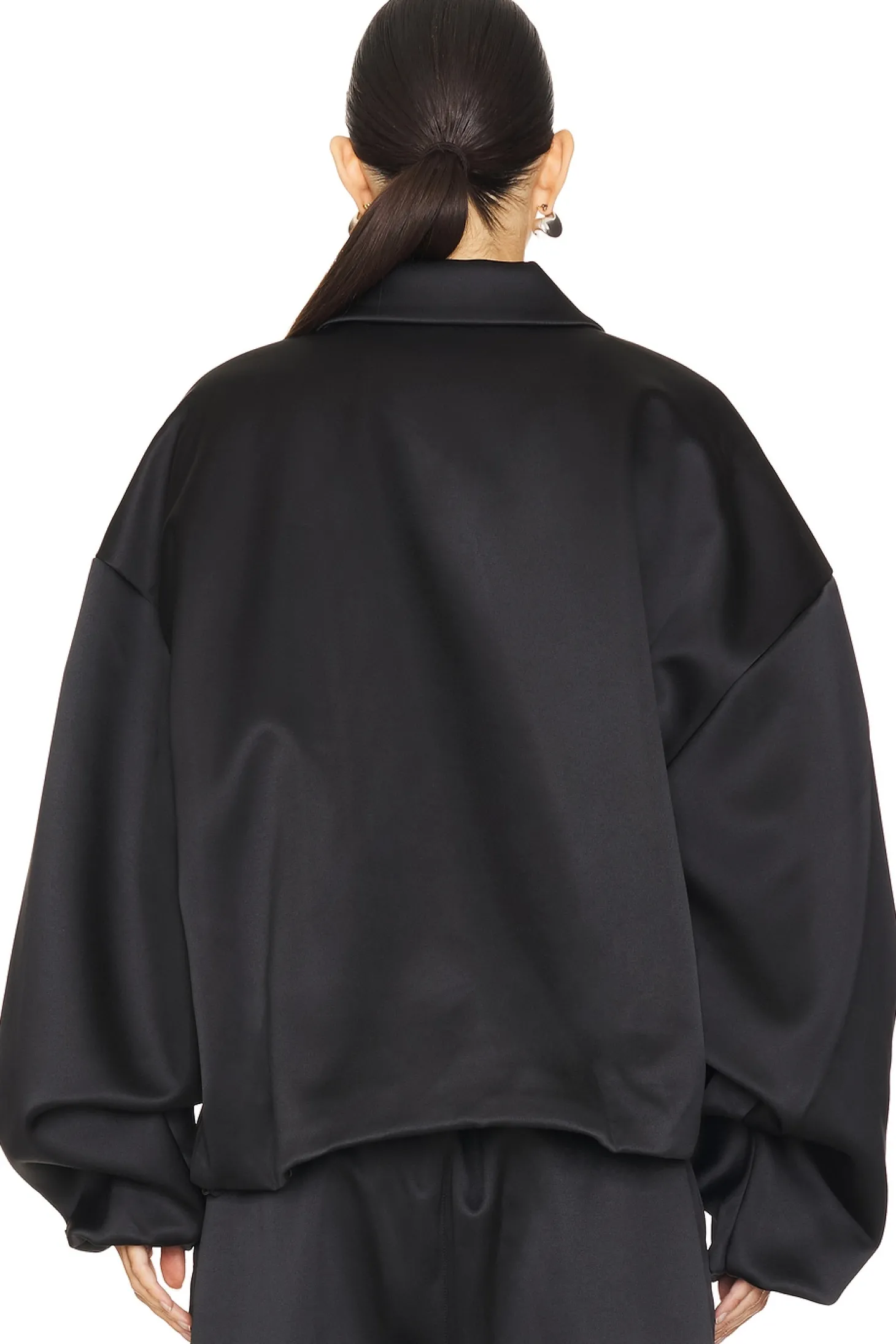 Self 1: 97% polyester 3% spandex Self 2: 95% polyester 5% spandex.Made in China.Hand wash.Hidden front zipper closure.Side seam pockets.Adjustable drawstring at waist.Shiny jersey fabric