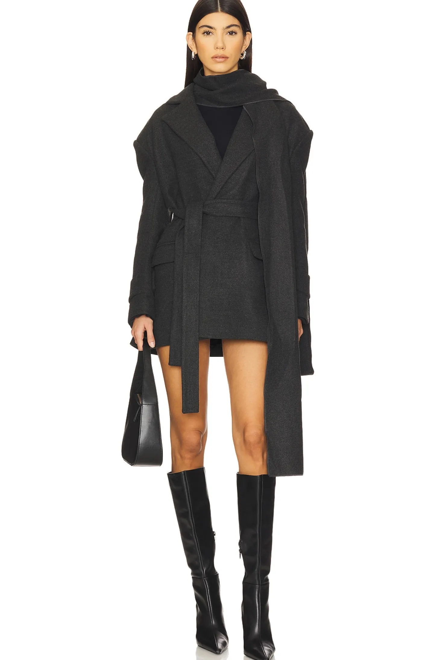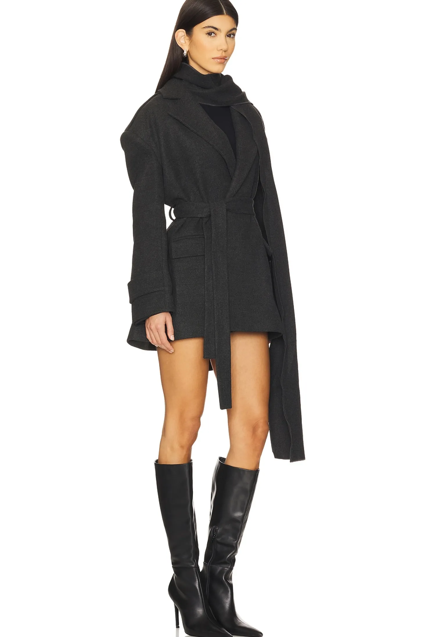 64% polyester 34% viscose 2% elastane.Made in Turkey.Machine wash.Open style with optional waist tie.Front flap pockets.Strap accent at cuffs.Includes scarf.Melton fabric with padded shoulders
