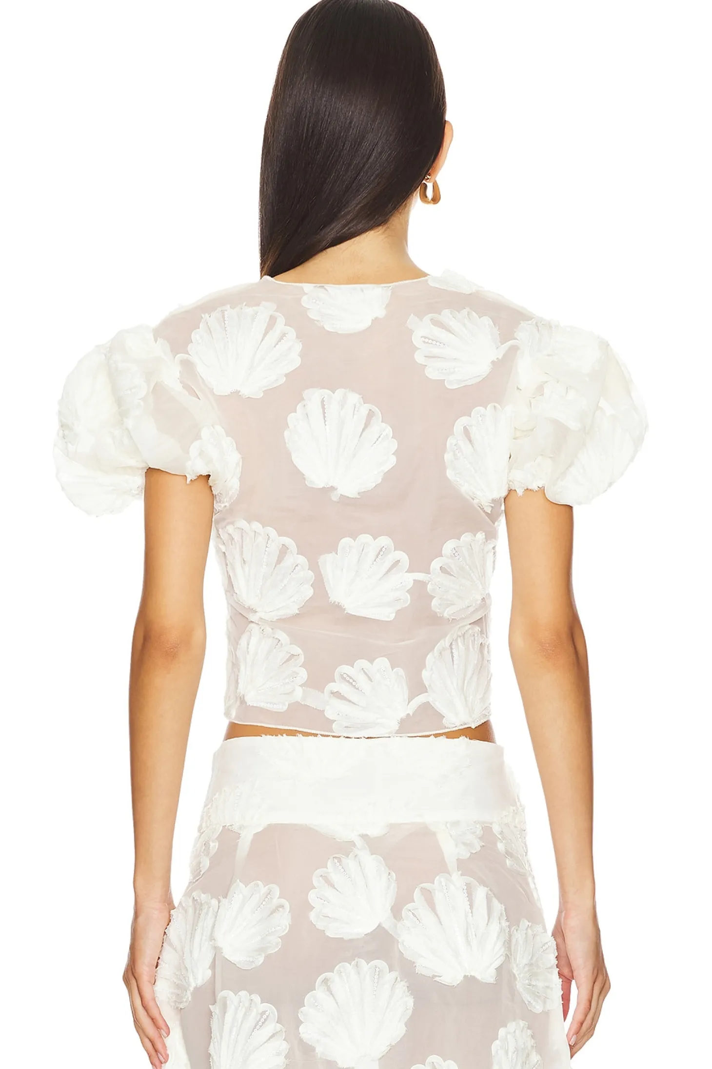 Organza textile.Imported.Dry clean recommended.Singular front button closure.Puff sleeves.Seashell pattern throughout.Lightweight fabric.Item not sold as a set
