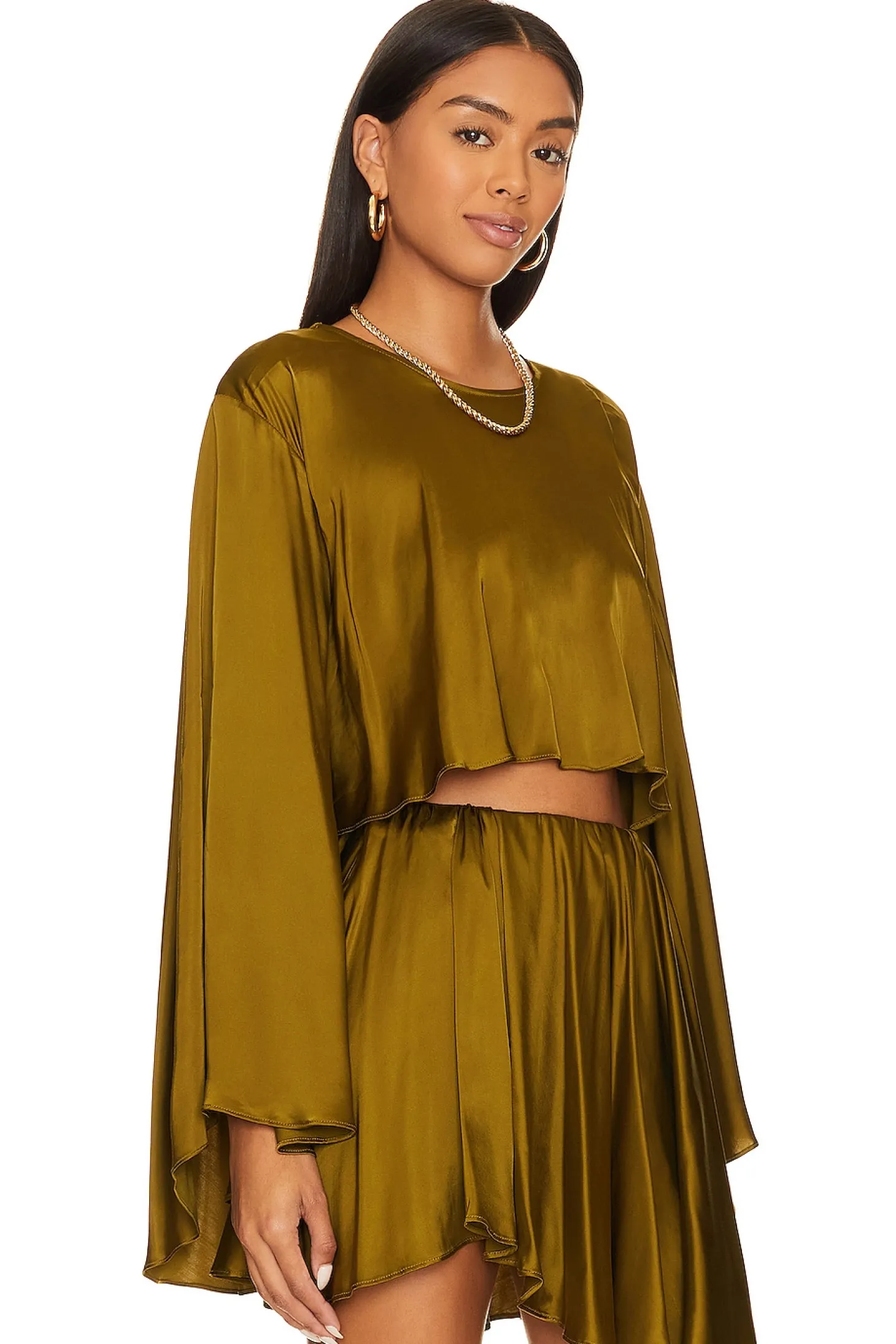 53% viscose 44% rayon 3% spandex.Made in China.Dry clean only.Back tie closures.Draped satin fabric.Item not sold a as set
