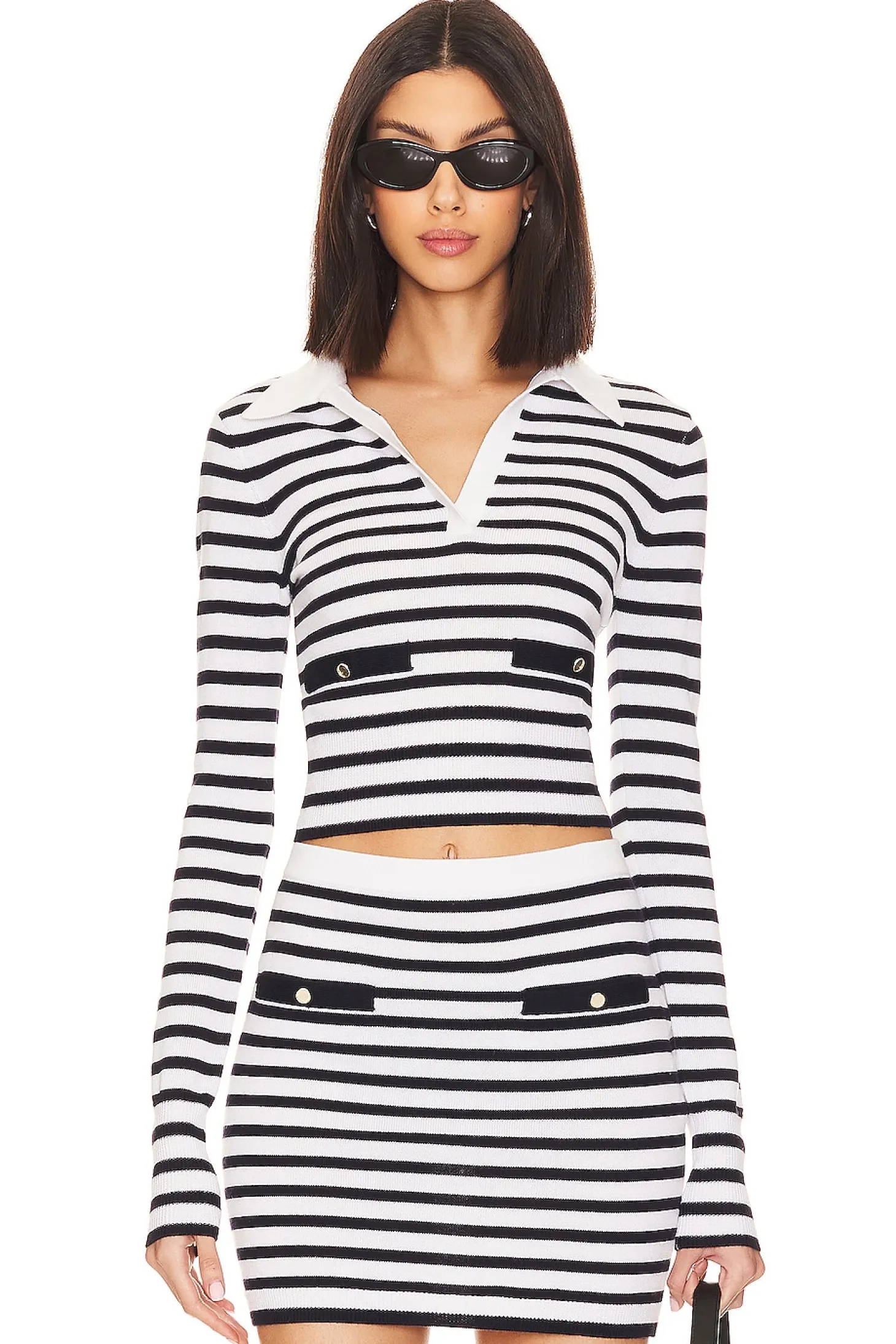 Introducing the Lovers and Friends Selene Striped Sweater in Black & White – a lightweight v-neck knit with staple striping throughout for a classic, coastal touch. Perfectly pair it with anything from the matching skirt (sold separately) to a structured denim..54% polyester 20% acrylic 20% nylon 6% wool.Made in China.Hand wash.Split neckline.Faux front welt pockets with button accents.Lightweight knit fabric.Item not sold as a set