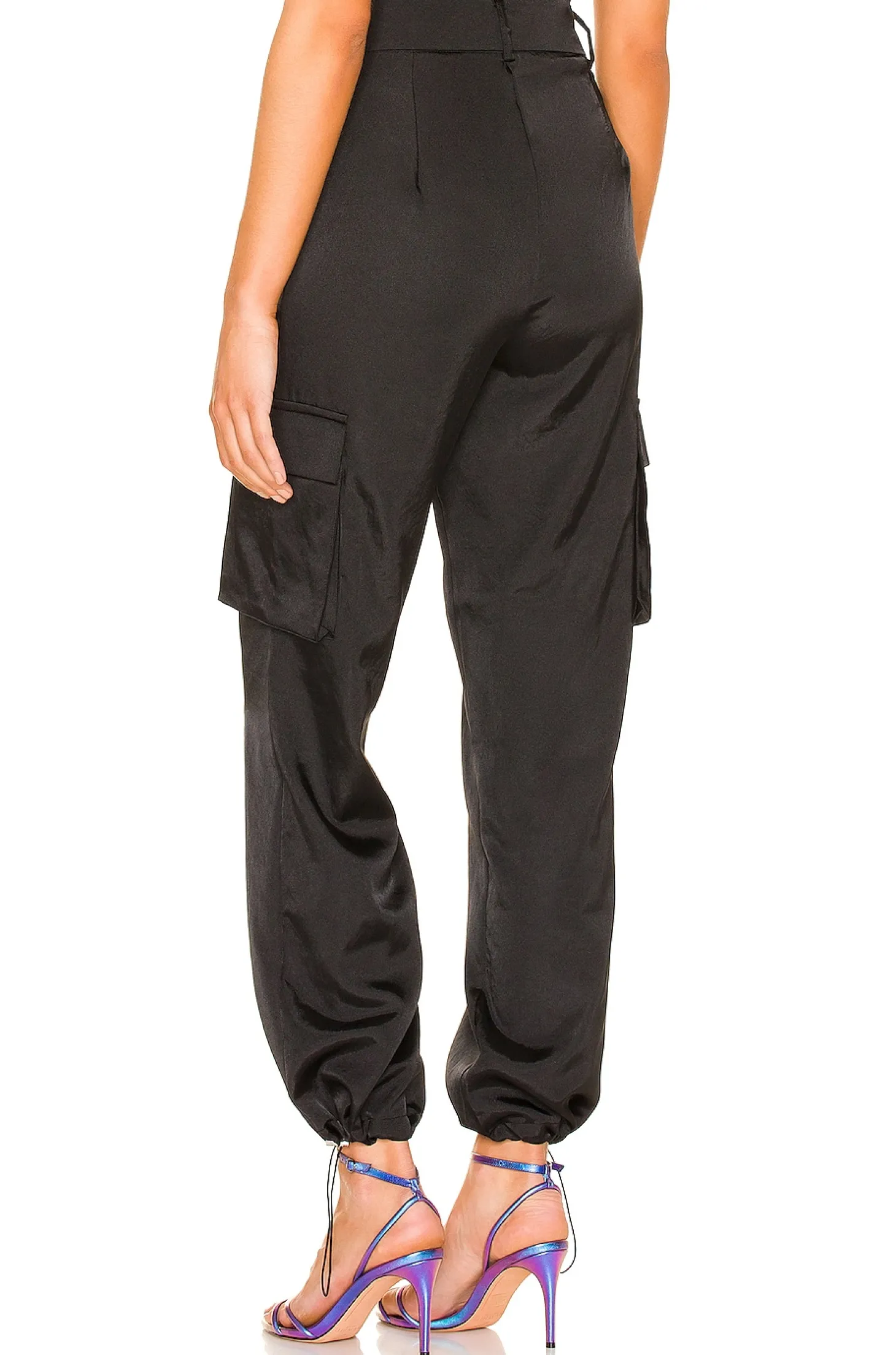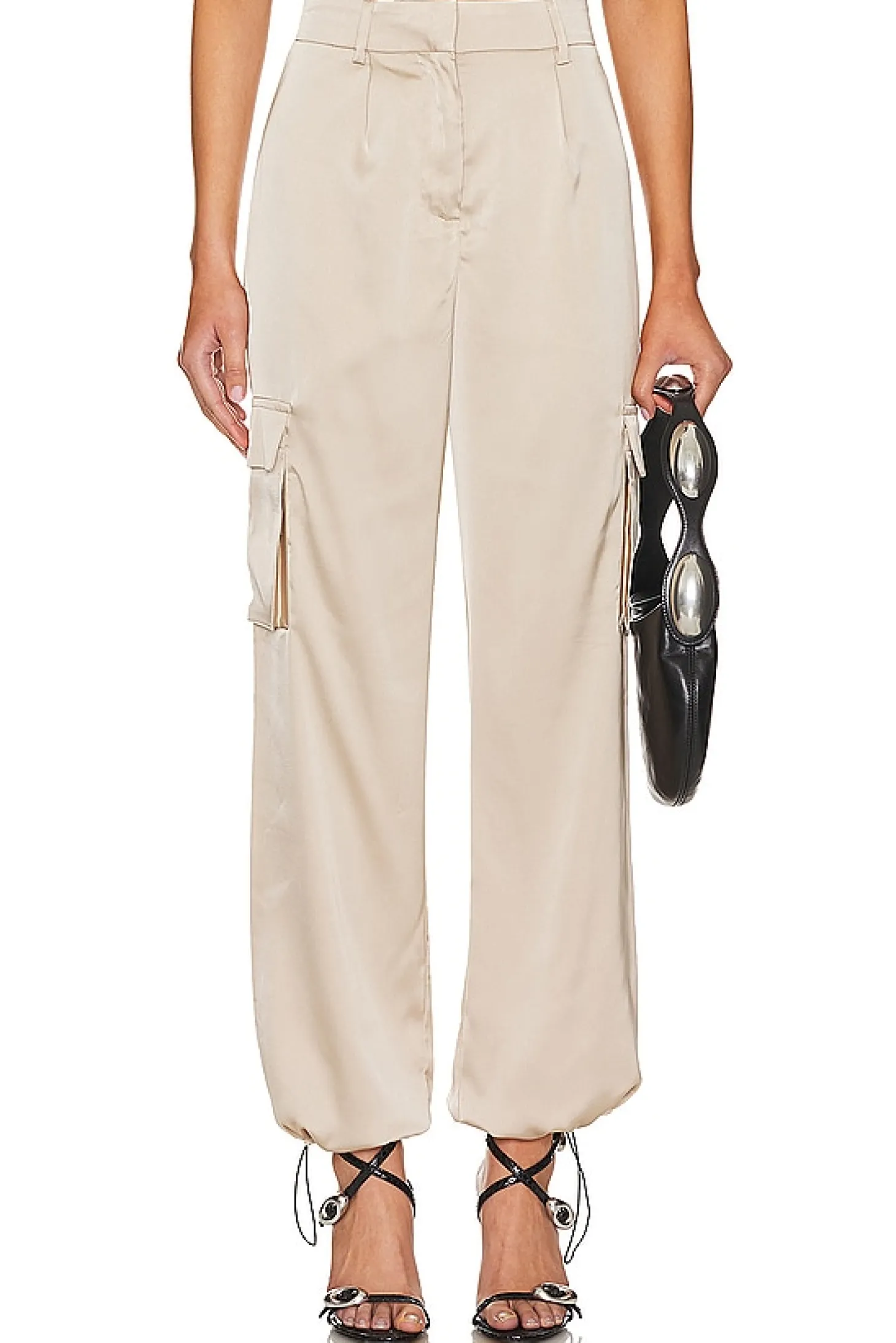 100% poly.Made in China.Hand wash.Zip fly with hook and bar closure.Cargo pockets at sides.Drawcord fastening at cuffs.Satin fabric.19" at the knee narrows to 10" at the leg opening