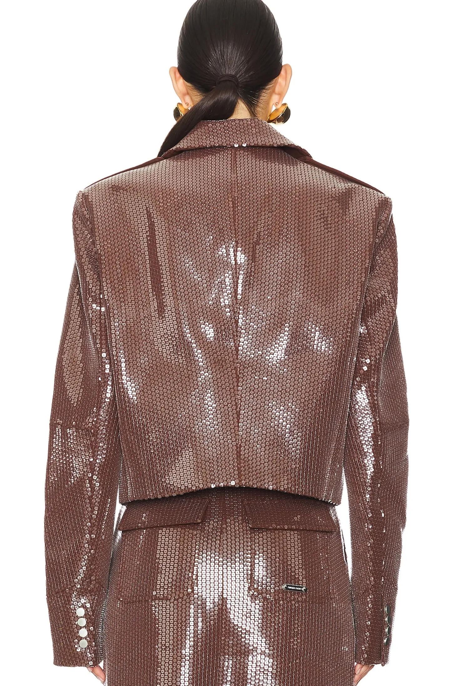 Self: 100% polyester Lining: 100% polyester Contrast Fabric: 100% polyethylene.Made in China.Dry clean only.Front snap button closure.Dual breast pocket.Snap button cuffs.Sequin embellished suiting fabric with padded shoulders.Item not sold as set