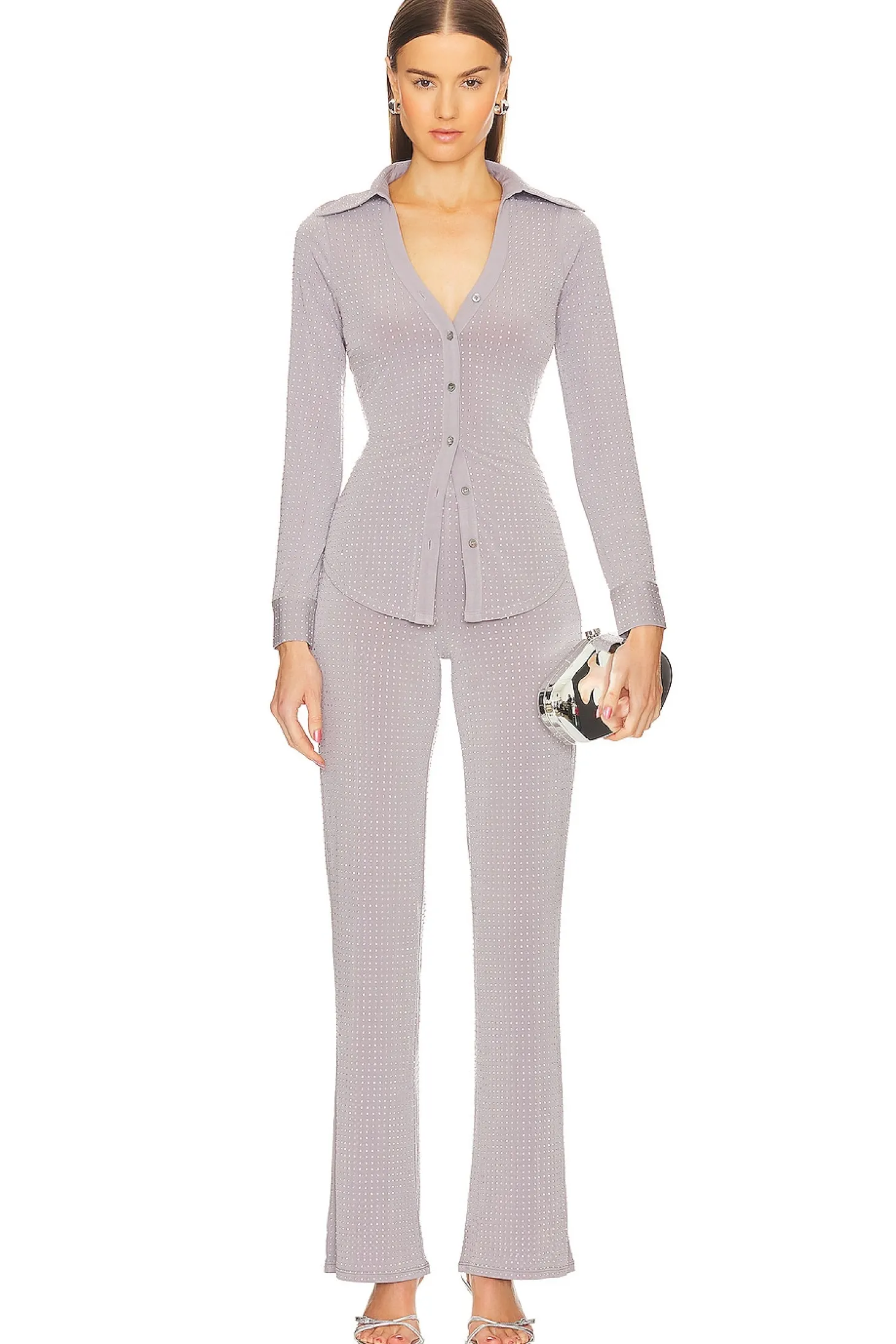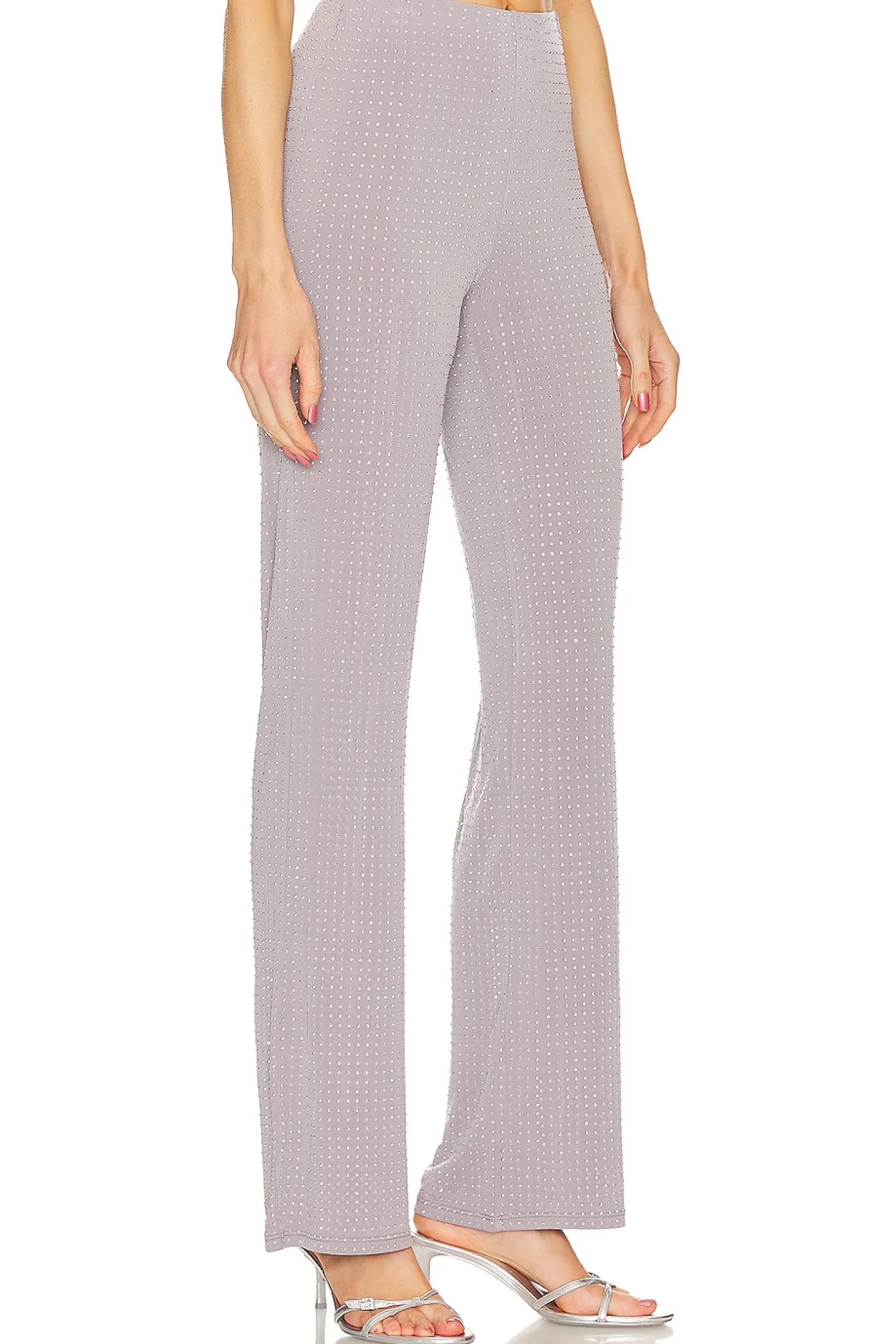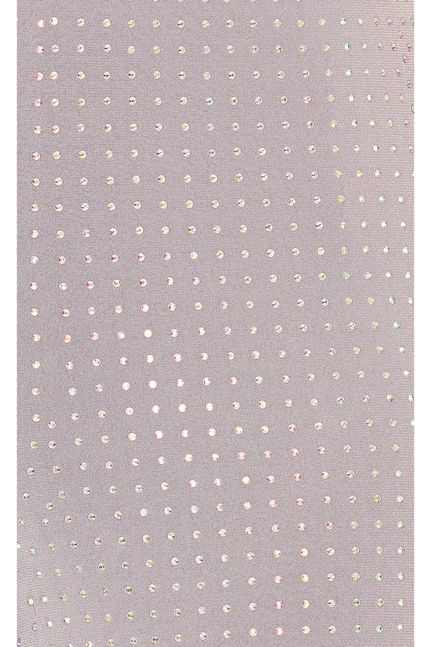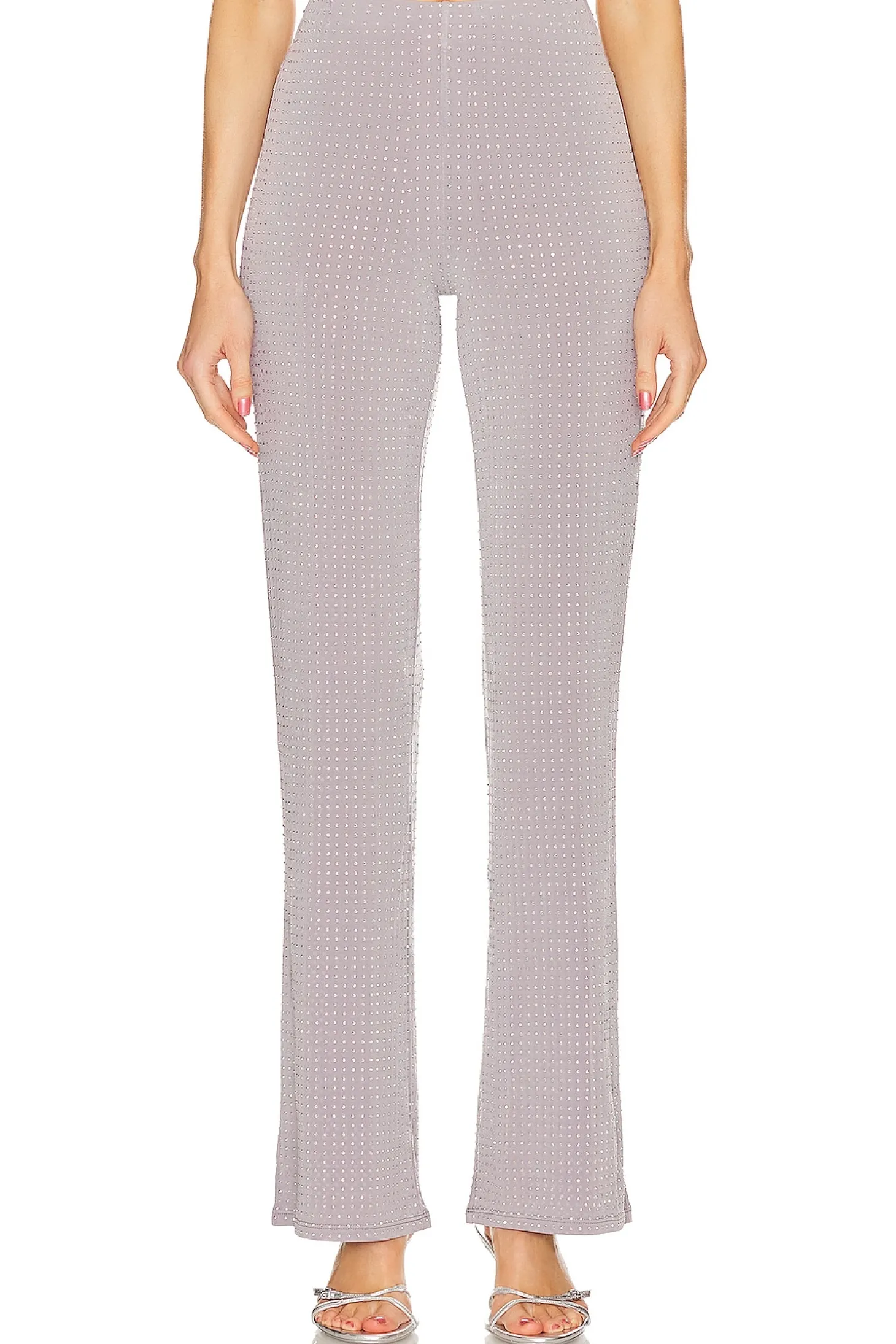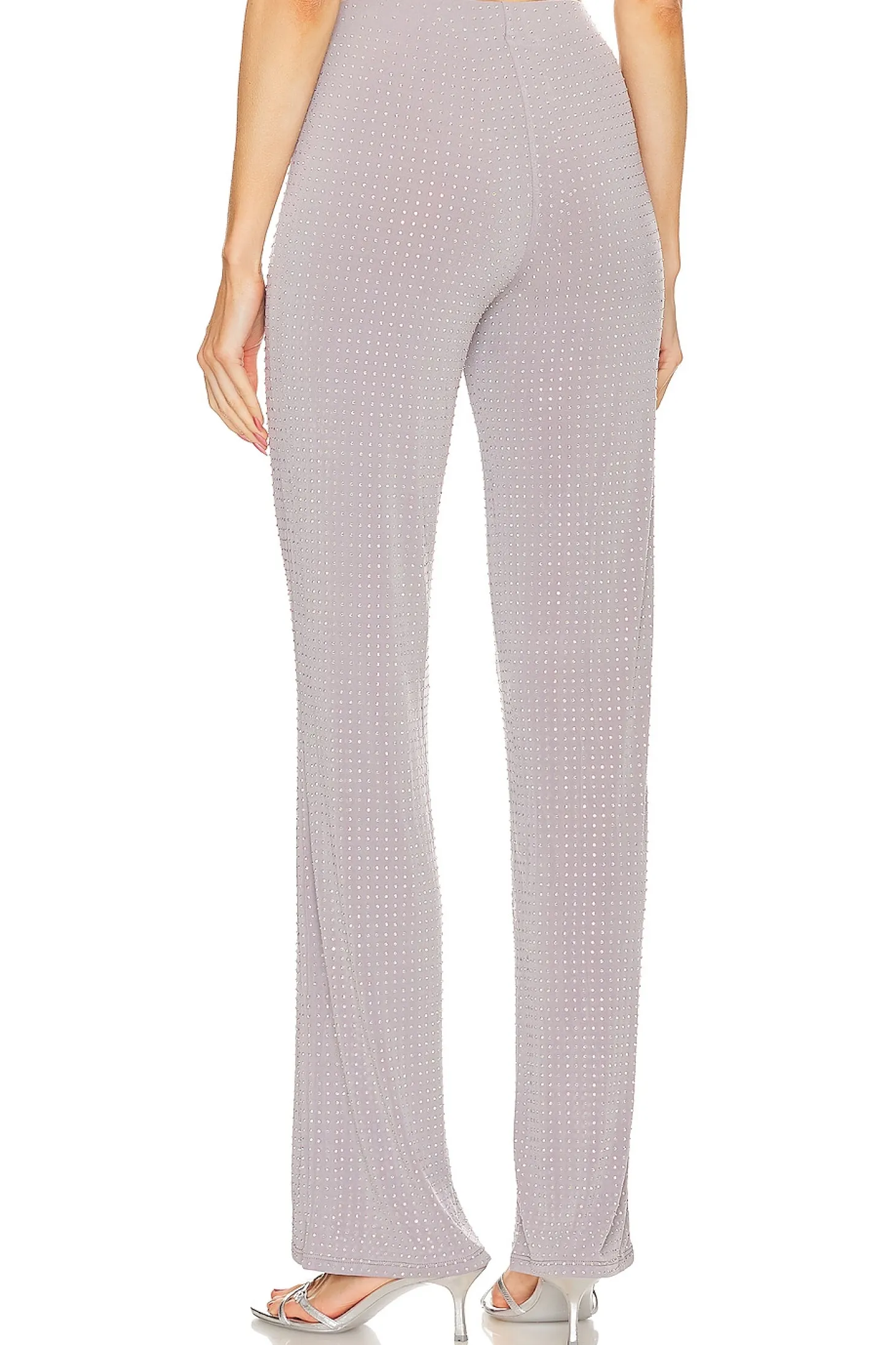 95% polyester 5% spandex.Made in China.Hand wash.Pull-on styling.Elastic waistband.Lightweight jersey fabric with crystal embellishments throughout.Item not sold as a set.16" at the knee and 16" at the leg opening