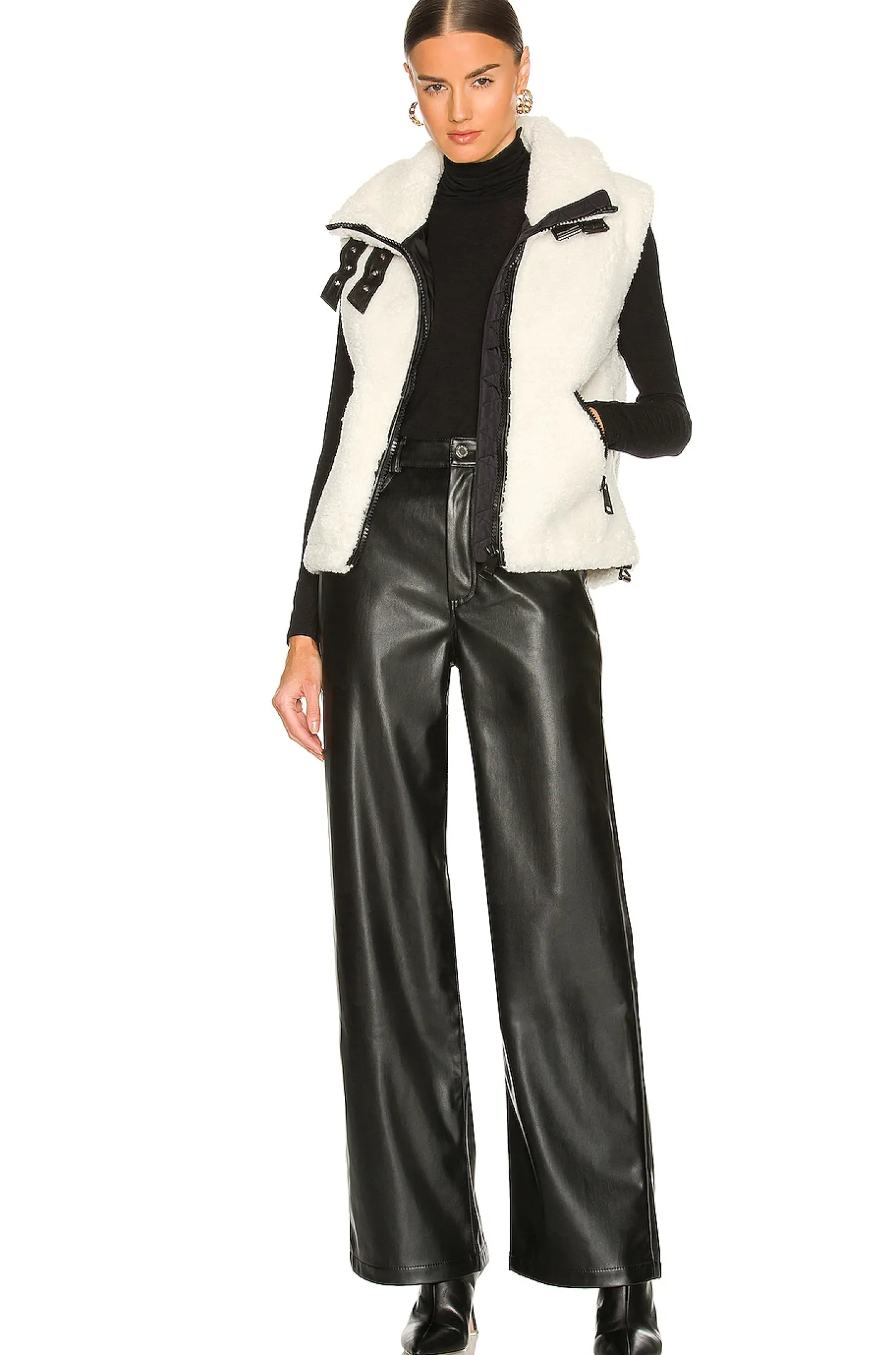 Self & Lining: 100% poly Contrast Fabric 1: 100% leather Contrast Fabric 2: 100% polyurethane.Made in Vietnam.Professional leather clean recommended.Front zipper closure with buckle closures at collar.Side slant pockets with zipper closure.Drawcord hem.Faux fur fabric