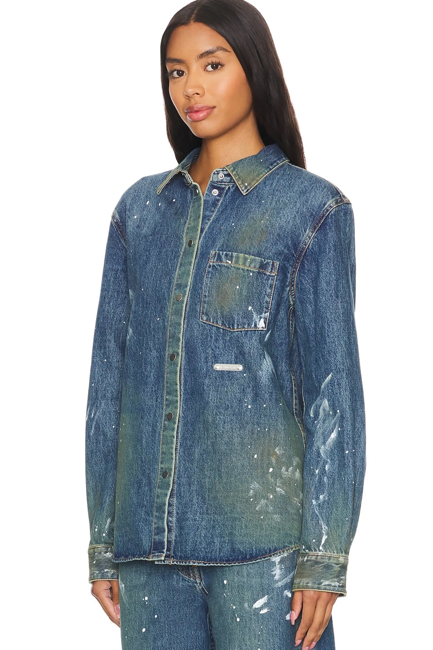 100% cotton.Made in China.Dry clean only.Front snap button closure.Breast pocket.Buttoned cuffs.Rigid denim with paint detail