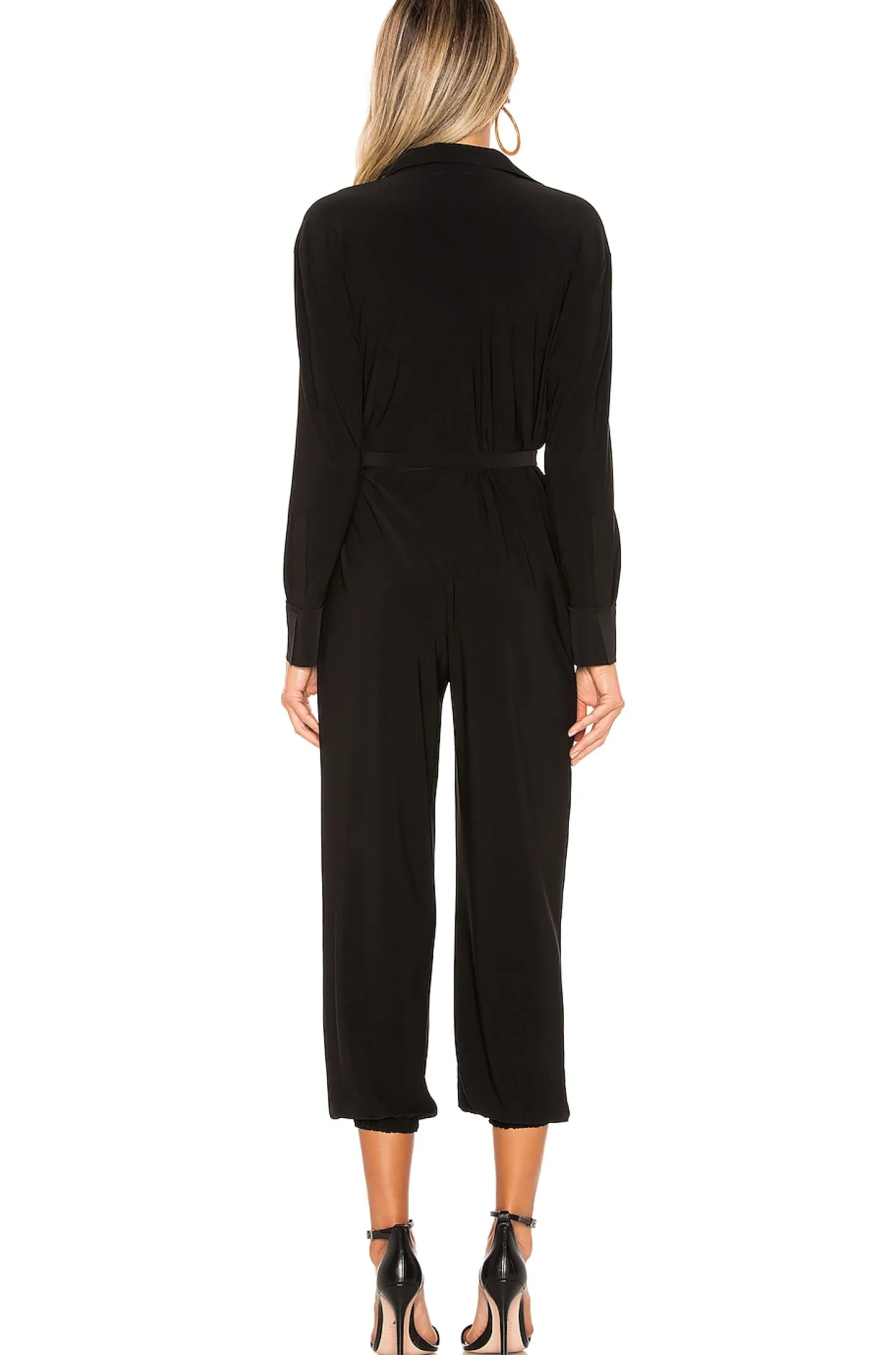 95% poly 5% spandex.Imported.Hand wash cold.Front velcro closure.Side seam pockets.Adjustable detachable belt with buckle closure.Elasticized leg openings.Body measures approx 25" in length 14" at the knee narrows to 8" at the leg opening.style runs large, size down.The Norma Kamali Shirt Jog Jumpsuit is a great lightweight piece that is a closet staple.