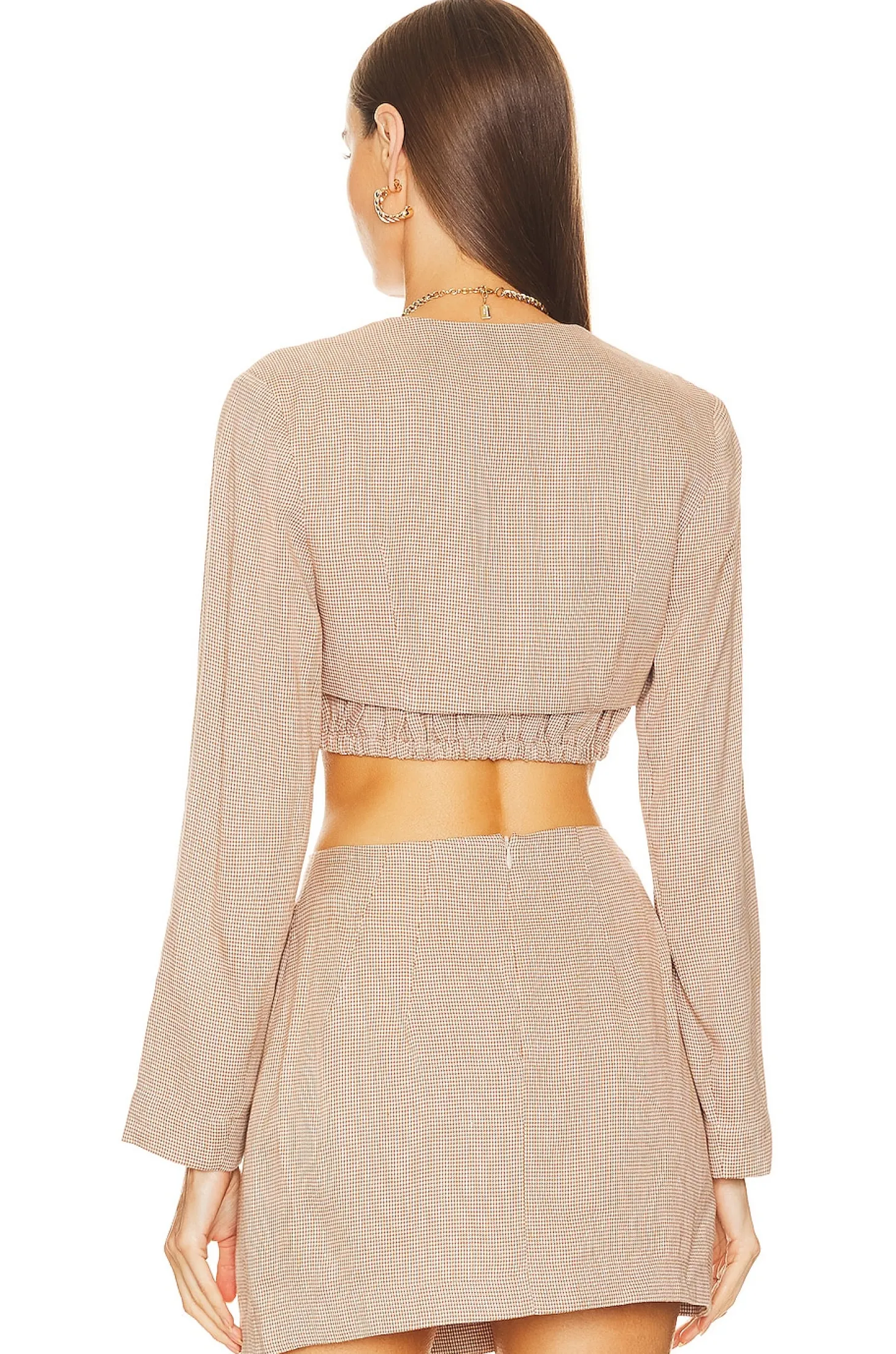 62% viscose 38% linen.Made in USA.Dry clean only.Open front.Lightweight linen fabric.Item not sold as set.Bandeu top is not included