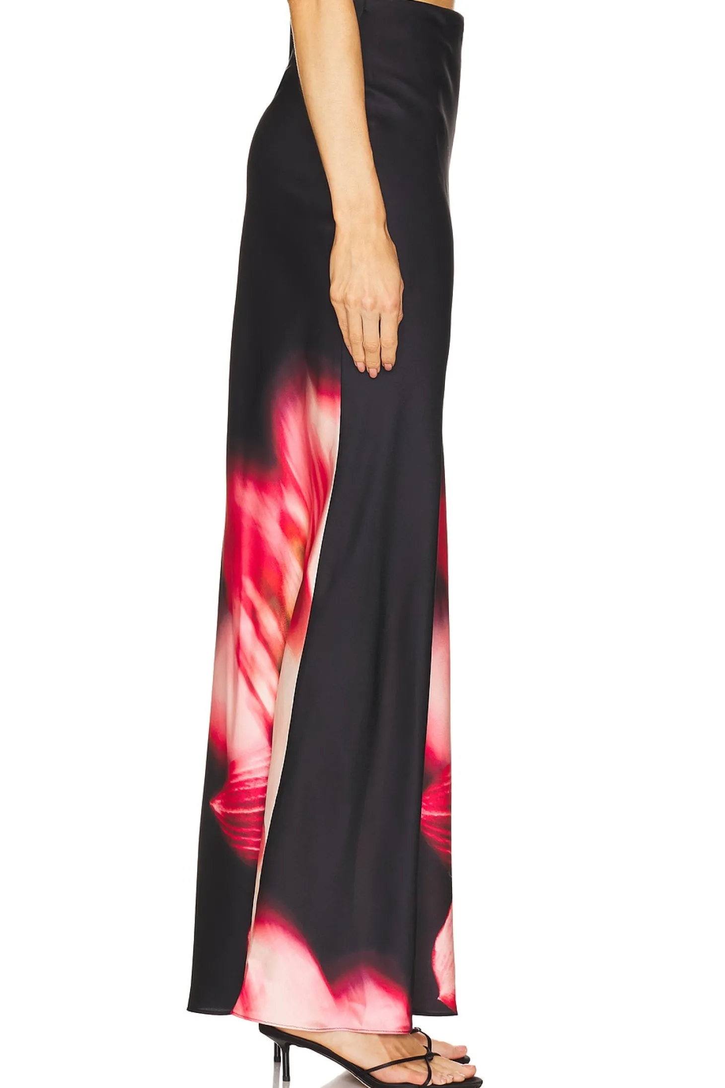 100% polyester.Made in USA.Dry clean only.Unlined.Hidden side zipper closure.Lightweight satin fabric.Item not sold as set.Skirt measures approx 45" in length