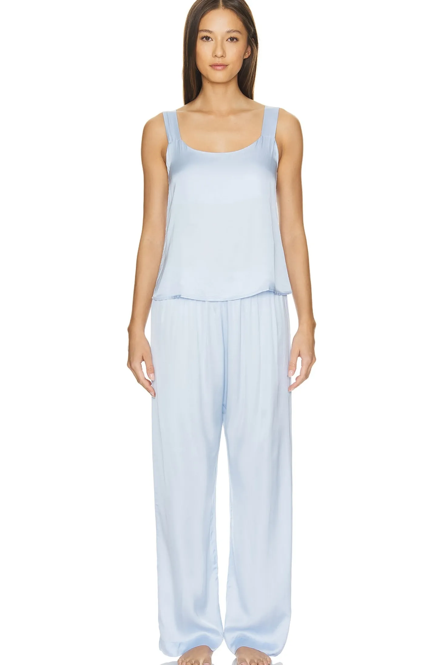 100% viscose.Made in USA.Hand wash.Pull-on styling with elastic waistband.Lightweight satin fabric.Item not sold as a set.21" at the knee narrows to 19" at the leg opening
